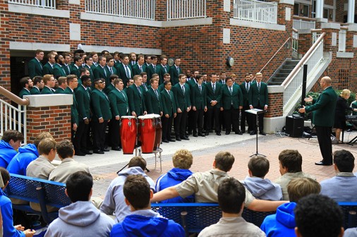 The Singing Men of Ohio, Ohio University’s Men’s Choir, perform a Brown Bag Concert during lunch in the Traditions Courtyard. The ensemble features 80 undergraduate and graduate students drawn from all majors of the institution. Blue Jays have enjoyed the musical sounds of various groups since the early 1980s, when as a sophomore, Harry Connick, Jr. ’85 approached then-student activities director (current alumni director) Mat Grau ’68 with the idea of a Brown Bag Concert series. Over the years, traveling bands and groups, alumni, and current Blue Jays have all performed during the lunchtime concerts.