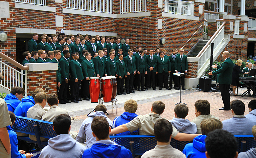 The Singing Men of Ohio, Ohio University’s Men’s Choir, perform a Brown Bag Concert during lunch in the Traditions Courtyard. The ensemble features 80 undergraduate and graduate students drawn from all majors of the institution. Blue Jays have enjoyed the musical sounds of various groups since the early 1980s, when as a sophomore, Harry Connick, Jr. ’85 approached then-student activities director (current alumni director) Mat Grau ’68 with the idea of a Brown Bag Concert series. Over the years, traveling bands and groups, alumni, and current Blue Jays have all performed during the lunchtime concerts.