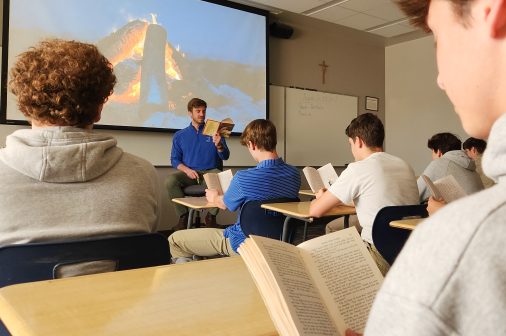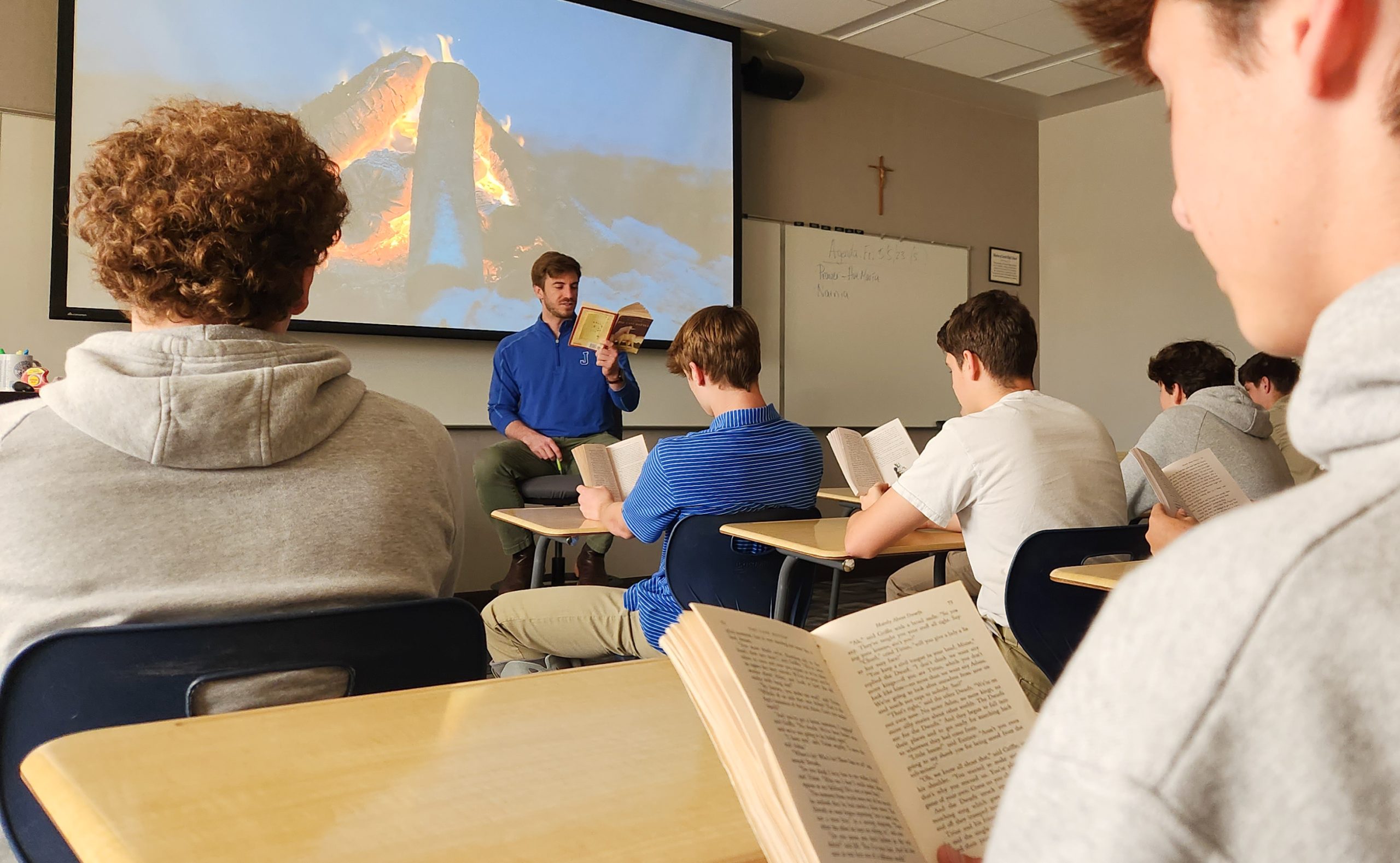 Mr. Daniel Augustin ’15 leads the students of his freshmen level Christology class in a reading of C.S. Lewis’ The Last Battle. The course, which covers the life of Christ, concludes with a discussion on what it means to follow Jesus by exploring Lewis’s final book in the Chronicles of Narnia saga. Mr. Augustin sets the scene with the fireplace in the background as Luke Saddler gets ready to read.