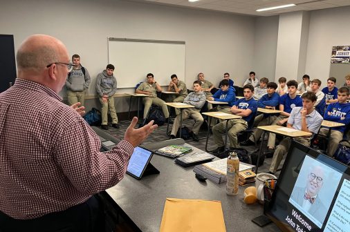 John Tobler, Deputy Secretary for Communications, Outreach and Promotions for the Louisiana Secretary of State and father of Jacob Tobler ’23, spoke to a standing-room-only crowd of Jesuit civics students during lunch on Friday, November 11. Tobler focused on the topic of election security.