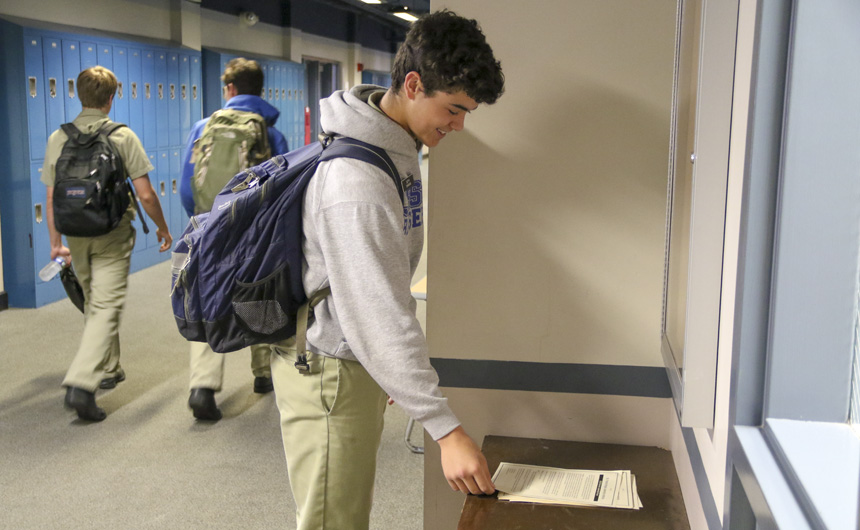 Rising senior Seth Dardar checks out the information sheet for the St. Francis Borgia Leadership Institute, a student leadership development program sponsored by Jesuit High School. The retreat is designed with the threefold purpose of identifying student leaders, offering formation in the virtues of leadership, and fostering collaboration among the different organizations, clubs, and teams within the school community. The event is open to all current Jesuit 8th – 11th graders. There will be two workshops offered, one at the end of May (5/30-5/31) and one at the end of July (7/25-7/26), in order to accommodate as many student schedules as possible. Each workshop will last 2 days. Both will cover the same content. Students can register now by completing this Leadership Forum Registration.