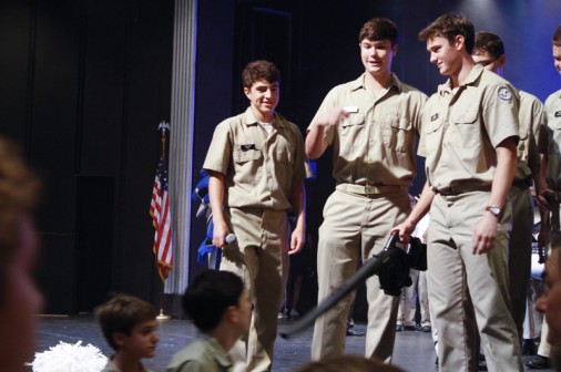 Senior student council leaders find an innovative way to cool down the newest Blue Jays after a high spirited pep rally in the auditorium. The New Student Orientation Day concludes with a pep rally held normally in the gym, but rainy conditions called for a location change. Seniors (from left) William Fine, Carl Hoefer, and Jacob Marshall should be pointing the leaf blower at themselves after their high-energy leadership getting new students charged with Blue Jay Spirit.
