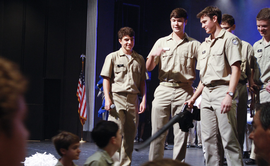 Senior student council leaders find an innovative way to cool down the newest Blue Jays after a high spirited pep rally in the auditorium. The New Student Orientation Day concludes with a pep rally held normally in the gym, but rainy conditions called for a location change. Seniors (from left) William Fine, Carl Hoefer, and Jacob Marshall should be pointing the leaf blower at themselves after their high-energy leadership getting new students charged with Blue Jay Spirit.
