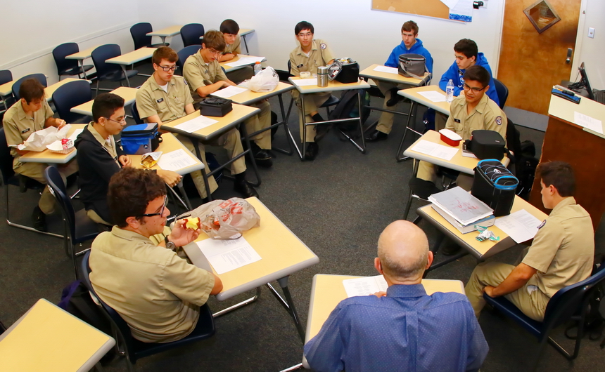 Blue Jays in the Experimental Literature Club meet every Wednesday during the first half of lunch to “read and discuss poems, short stories, and novel excerpts that make use of unusual literary techniques that fall outside of mainstream reading habits.” English teacher Mr. Gary Wyss (bottom of photo) leads a discussion of Ken Chen’s We Ennui. Chen is an American poet and lawyer, and the executive director of the Asian American Writers’ Workshop. Among those participating in the discussion are, clockwise from Mr. Wyss: Tristan Killgore, Cristian Orellana, Sterling Stafford, Kenneth Krizan, Phillip Gerarve, Anthony Stoner, Andrew Vuong, Logan Yokum, Luke Navarro, Jaime Colon, and Steven Sellers.