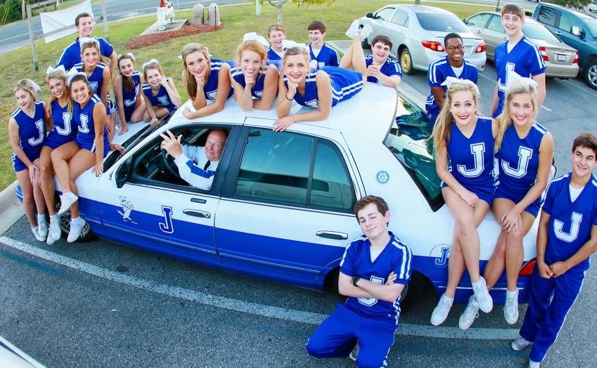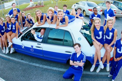 Br. Billy Dardis, S.J. ’58 is all smiles sitting in the Jaybird’s seat of the Jaymobile, which happens to be surrounded by and covered with 19 Jesuit Cheerleaders. As moderator of the cheerleaders, Br. Dardis commandeered the eye-catching Grand Marquis on Friday afternoon from its owner, Jesuit alumnus Mike Waldo ’70 of Pensacola. After the Jesuit Cheerleaders were all snugly stuffed into the Jaymobile, Brother put the pedal to the metal and drove 90 m.p.h. from Carrollton and Banks all the way to Pensacola for the football game between the Jays and the Gators of Escambia High School. Brother is typically publicity shy, but since this incredible feat focused on his cheerleaders, he quickly contacted the editors of Ripley’s “Believe It or Not.” Proudly informing Ripley’s of this achievement, Brother let it slip that five cheerleaders had been crammed into the trunk of the Jaymobile. Unfortunately, this disqualified the accomplishment for consideration by the Ripley folks. Brother became extremely agitated and wailed over and over, “My cheerleaders are Blue and White for all the days of life.” Brother was in a deep reverie when the cheerleaders shouted, “Go Jays!” His eyes suddenly popped wide open. It took him only a second or two to realize he had nodded off while waiting for the Wild Photographer to set up and snap an impromptu photo in the parking lot of a Chile’s restaurant, located 10 minutes from the stadium. As soon as the picture was taken, Brother once again assumed command. “Ok, everybody, let’s go,” he shouted authoritatively. “All aboard the Spirit bus. Right now. C’mon, don’t waste time. Got to go. Move it. Got to get to the game.”