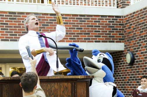“Et tu, Jayson?” asks a Caesar-clad Mr. Bob Roso at the moment of his assassination during the opening skit for Homecoming Week at Monday’s Morning Assembly. The student council launched this year’s theme – “Romecoming Week” –by riffing on the iconic lines from William Shakespeare’s play Julius Caesar. Here, Caesar is attacked by a group of student council senators and finally stabbed by Jayson before taking his last breath. “Romecoming” activities kicked off Monday at lunch with courtyard jousting and will continue through the week as students and faculty prepare for the Jesuit-Holy Cross football game on Friday.