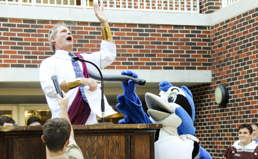“Et tu, Jayson?” asks a Caesar-clad Mr. Bob Roso at the moment of his assassination during the opening skit for Homecoming Week at Monday’s Morning Assembly. The student council launched this year’s theme – “Romecoming Week” –by riffing on the iconic lines from William Shakespeare’s play Julius Caesar. Here, Caesar is attacked by a group of student council senators and finally stabbed by Jayson before taking his last breath. “Romecoming” activities kicked off Monday at lunch with courtyard jousting and will continue through the week as students and faculty prepare for the Jesuit-Holy Cross football game on Friday.