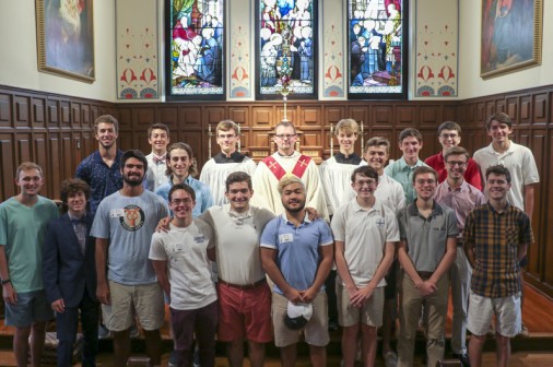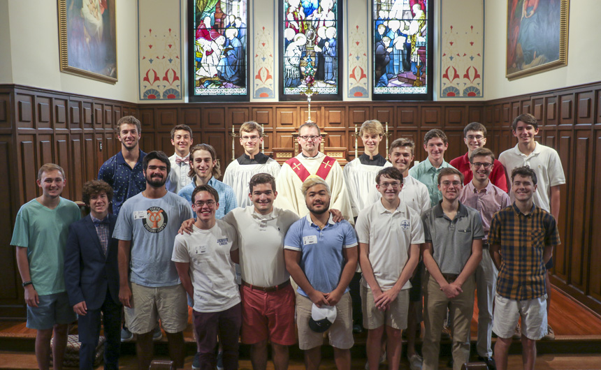 Members of the Jesuit High School community gathered in the Holy Name of Jesus Chapel for a feast day Mass celebrated by chaplain Fr. Kevin Dyer, S.J. More than 60 people—including faculty, staff, students, and recent alumni—filled the 2nd-floor chapel at 11 a.m. to honor the patron saint of soldiers, education, and of course the Society of Jesus. After Mass, Fr. Dyer joined the students and young alumni for a photo in front of the three stained-glass windows of Ignatius.