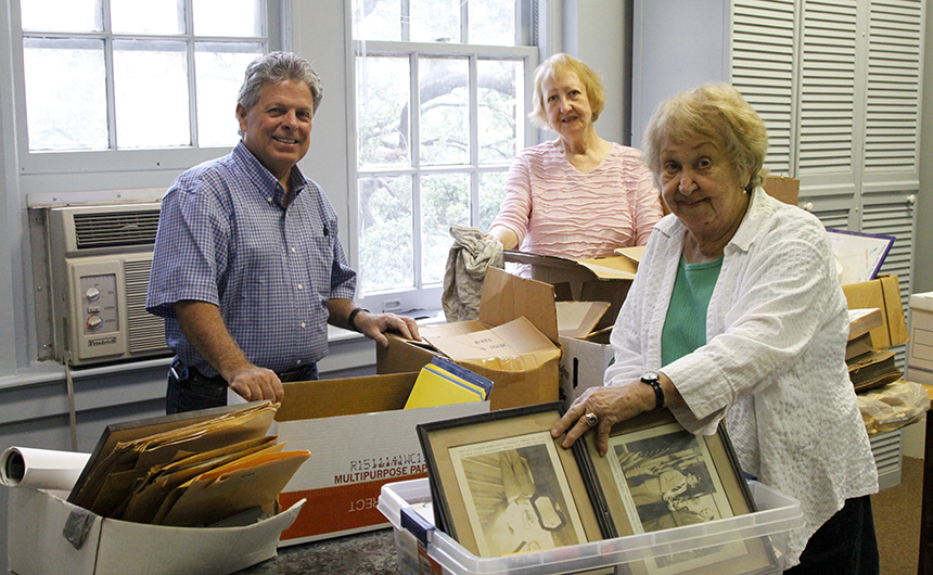 Lynn (center) and Winifred “Winnie” Worley (right) assist alumni director Mat Grau ’68 with items from the Jesuit archives. Spanning more than 165 years, the school’s vast archives boast everything from historic photos to newspaper clippings to original report cards to athletic and academic memorabilia. Lynn and Winnie have donated several items to the archives, including a nearly century-old class photo taken at the original campus on Baronne and Commons. Lynn and Winnie are the daughters of the late Andrew Worley (1919) and the sisters of Joseph Worley ’55, namesake of The Joseph Michael Worley Memorial Award — given to the senior who, by his unselfishness, sportsmanship, and spirit during his career at Jesuit, enhanced the athletic program either as a player, manager, trainer, or student.