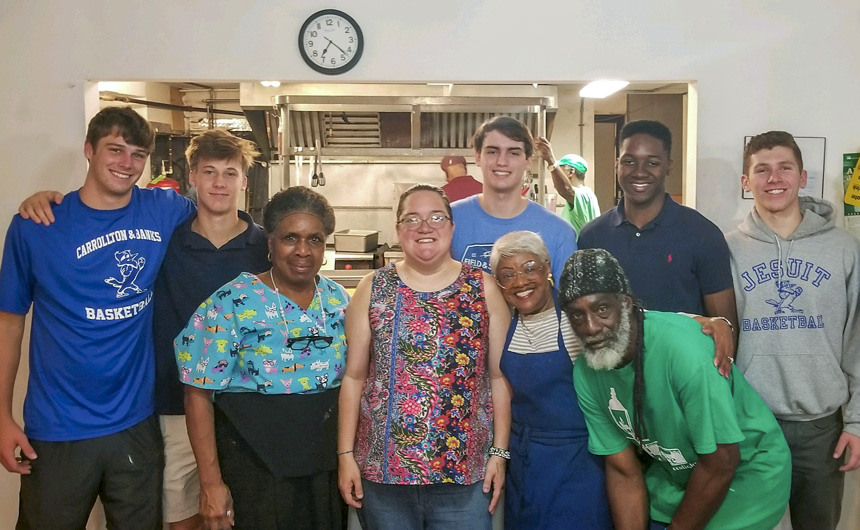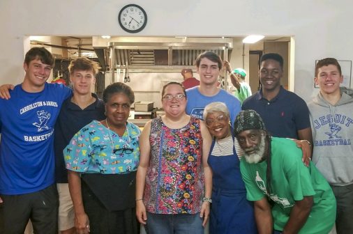 On Wednesday morning Blue Jay basketball players Zach Deblieux, Kyle Haupt, Nick Artigues, Kylan Steele, and Nick Brewster served breakfast to the homeless at the Living Witness Church in Central City. The breakfast program is run by Grace at the Greenlight, a nonprofit organization that serves a morning meal to between 70 and 100 homeless men and women every day. This group of Blue Jays were the first of many, as Jesuit is planning to bring students to serve breakfast on the first and third Wednesday of every month. Students interested in participating should see Mr. Murphy in Room 225 to sign up.