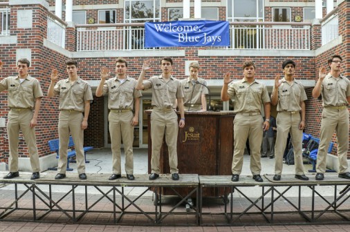 Student body president Dowen Fife, after being sworn in by Jesuit president Fr. Christopher Fronk, administers the Oath of Office for the remainder of the Executive Board. Pictured in front of Fife (from left), are Gavin Skipper (Executive Aide), Charles Korndorffer (Executive Aide), Max Bond (Executive Aide), Carter Montalbano (Junior Class President), Marc Dougherty (Secretary), Neehar Desai (Treasurer), and Josef Ernst (Vice President). Langston Goldenberg, the senior Class President, was not present and will be sworn in at another date. The Oath of Office is as follows: “I, (name), affirm that I will faithfully execute my office on the Jesuit Student Council, and I will, to the best of my ability, act as a positive example in all that I do, foster Blue Jay spirit in our community, preserve the Student Council Constitution, and live up to the ideals and norms of Jesuit High School.”