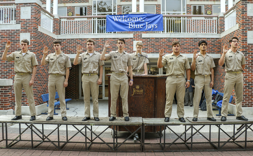 Student body president Dowen Fife, after being sworn in by Jesuit president Fr. Christopher Fronk, administers the Oath of Office for the remainder of the Executive Board. Pictured in front of Fife (from left), are Gavin Skipper (Executive Aide), Charles Korndorffer (Executive Aide), Max Bond (Executive Aide), Carter Montalbano (Junior Class President), Marc Dougherty (Secretary), Neehar Desai (Treasurer), and Josef Ernst (Vice President). Langston Goldenberg, the senior Class President, was not present and will be sworn in at another date. The Oath of Office is as follows: “I, (name), affirm that I will faithfully execute my office on the Jesuit Student Council, and I will, to the best of my ability, act as a positive example in all that I do, foster Blue Jay spirit in our community, preserve the Student Council Constitution, and live up to the ideals and norms of Jesuit High School.”