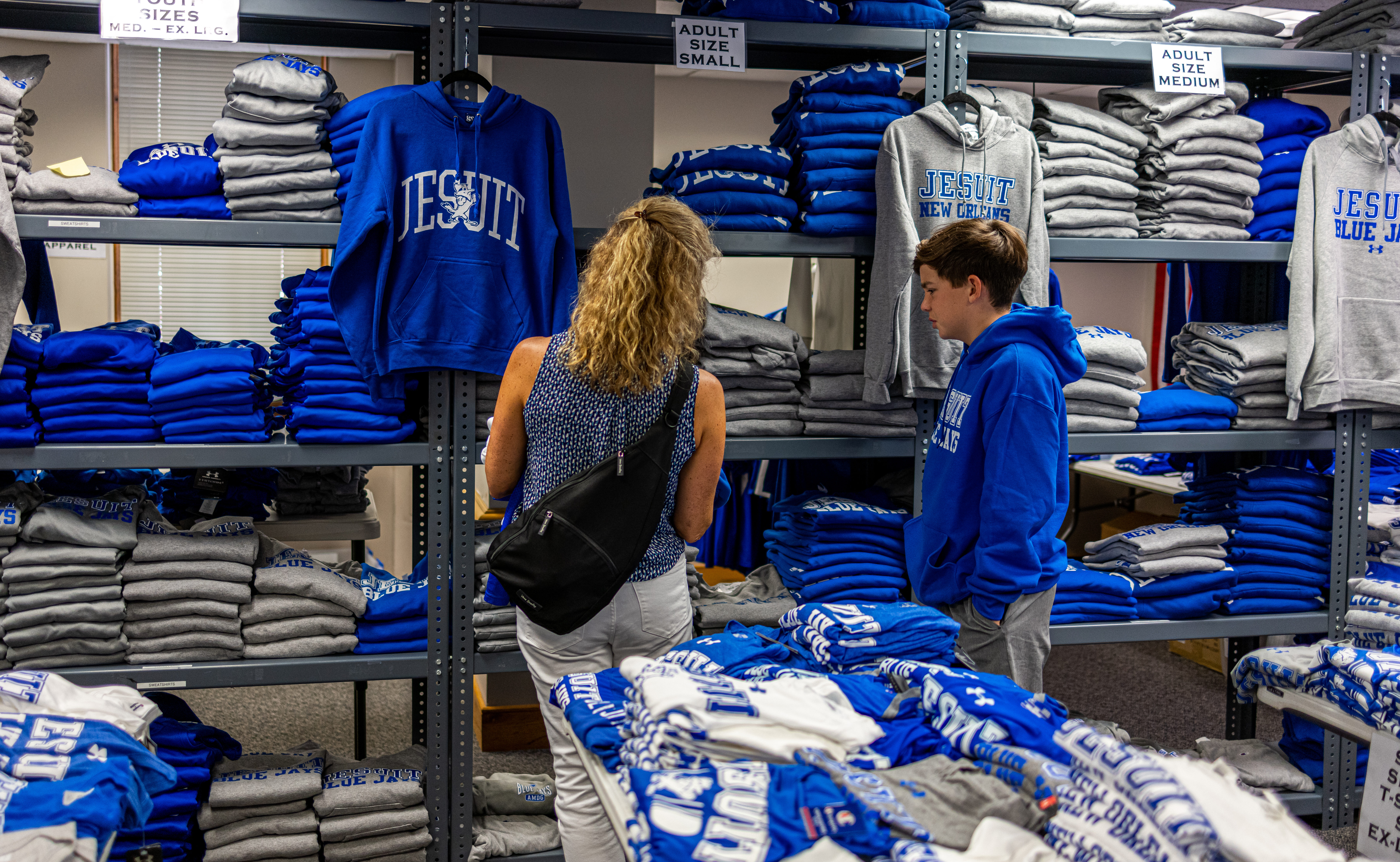 A new Blue Jay mother and her son browse the selection in the temporary Blue Jay shop in room 132. Under the new guidance of Wanda Montalbano, the fresh and improved shop will be moving into the new Administrative building once construction is completed.