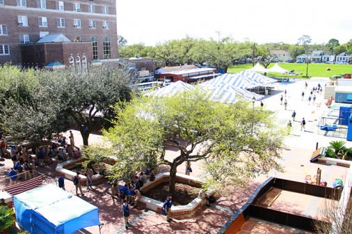 … Bazaar Week! The Traditions Courtyard begins to take on a familiar look as work crews make progress setting up the stage, tents, and booths for the main event. The Blue Jay Bazaar will take place, rain or shine, from 11 a.m. to 9 p.m. Bring your family, enjoy some great food, dance to live music, play games, enter into your favorite raffle, and take home prizes, desserts, and a frozen entrée. While you’re enjoying the day, snap a few pictures and post them on your favorite social media with #BlueJayBazaar to follow the fun.