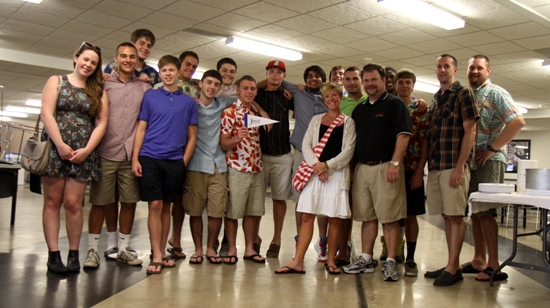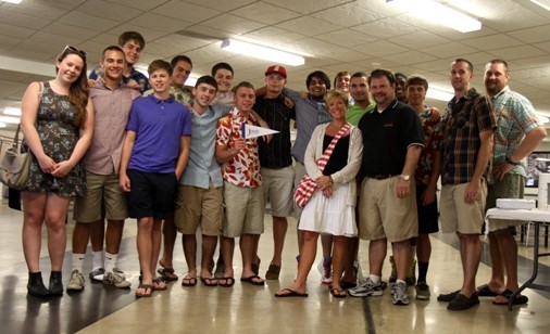 Paul Perez ’79 (wearing black shirt on right) hosted a jambalaya dinner in the Student Commons recently for students and staff from Jesuit High School in Sacramento, California, where service projects are built into the school curriculum. Thirteen students and three faculty members teamed up with the St. Bernard Project to sand dry wall in New Orleans East. It’s the fourth year Perez has hosted a group of volunteer workers at his alma mater.