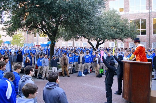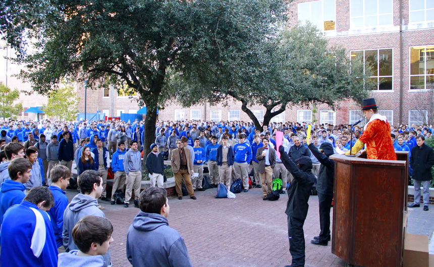 To promote the annual Winter Dance on Saturday, January 31 from 8 – 11 p.m. in the Traditions Courtyard , this trio of seniors — Chris Mills (at the podium), along with Harrison Bond (left) and Will Arnold — directed an appeal to all Blue Jays, telling them, “There are four things in a school dance that are considered compulsory, obligatory, indispensable, necessary, required, basic, mandatory, essential, vital, requisite, needed, crucial, key, critical, important, imperative, major, noteworthy, unavoidable, historic, meaningful, and desired. Those four things are: Right Judgment, Attractive Girls, Vibrant Colors, and Electric Music. If you also like these four things, or even if you don’t, you should attend JVEB, or Jayson’s Vengeance Electric Bugaloo. It will be Legen… wait for it… dary.”