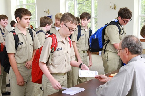 Freshman Matthew Vlosich picks up his ACT Aspire score report from Guidance Counselor Mr. Andrew Schiro. Freshman filed in and out of St. Ignatius Hall throughout lunch Tuesday to pick up their standardized test scores. The ACT Aspire assesses student readiness in English, math, reading, science, and writing. Jesuit offers several ways to help Blue Jays prepare for various standardized tests, such as the ACT and PSAT/SAT Prep Courses.