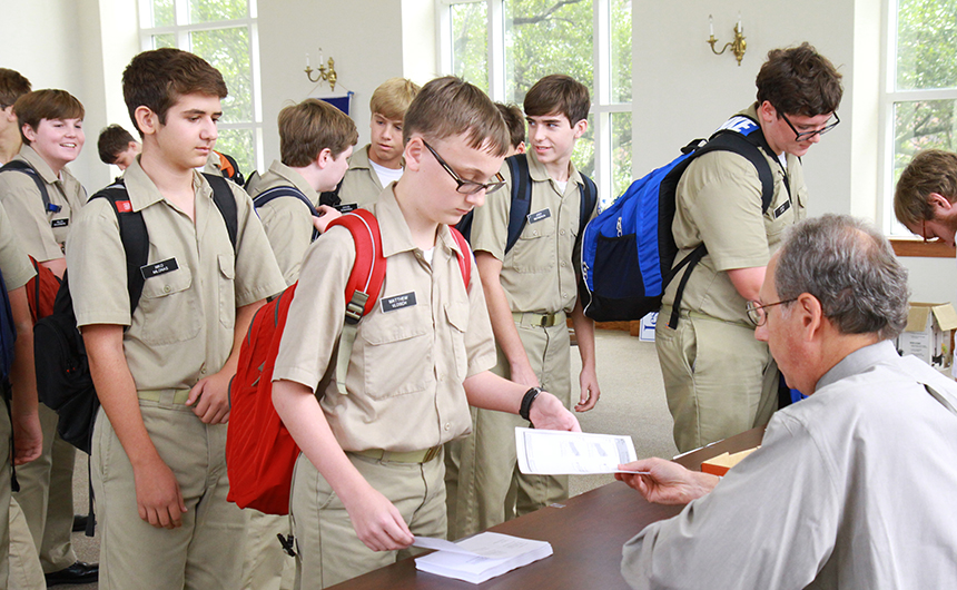 Freshman Matthew Vlosich picks up his ACT Aspire score report from Guidance Counselor Mr. Andrew Schiro. Freshman filed in and out of St. Ignatius Hall throughout lunch Tuesday to pick up their standardized test scores. The ACT Aspire assesses student readiness in English, math, reading, science, and writing. Jesuit offers several ways to help Blue Jays prepare for various standardized tests, such as the ACT and PSAT/SAT Prep Courses.