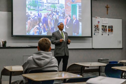 Former Jesuit Alumnus of the Year Edgar “Dooky” Chase III ’67 speaks during the first half of lunch in room 210. Chase spoke about the history of the Civil Rights movement in New Orleans, with a focus on the role of his family restaurant as a gathering place for local and national leaders. Chase delved into a number of topics including the tough and uplifting times of starting at Jesuit, cleaning the restaurant floors at 5 a.m., and the musical influences of his day.