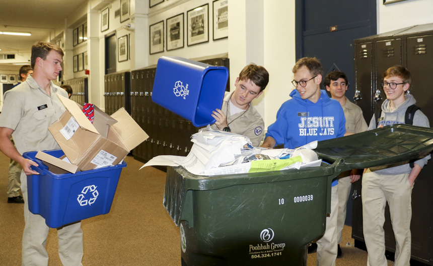 Environmental stewards of campus, seniors Conor Shwartz, William Braham, and Dusty Doll, took to the halls to tackle the overflowing bins of recyclable material. Students in the Green Club and the National Honor Society volunteer each Thursday afternoon to empty the hallway bins. Green Club members also participate in activities that include going on field trips, gardening, recycling, and hosting guest lecturers.