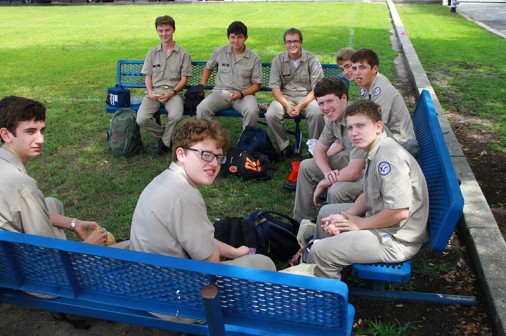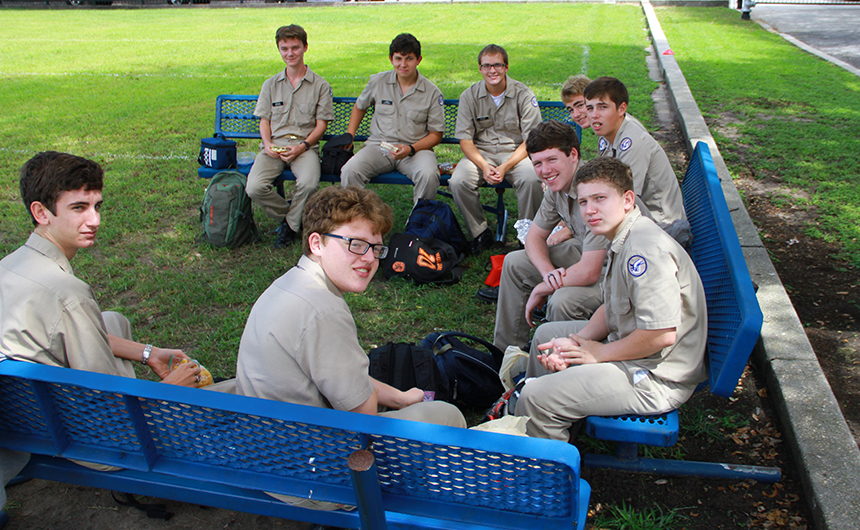 Many alumni classes meet regularly for lunch – some monthly, some quarterly, some yearly. While the Blue Jays catch up on current events in their lives, the important discussion usually focuses on stories of the old days at Carrollton and Banks. Today’s Jays are creating the stories that they will retell over and over through the years. And these seniors have already begun a tradition of lunch gatherings to talk about their current events and their life at Jesuit. Since their sophomore year, (clockwise, from left) Carlos Zervigon, James Stoddard, Peyton Ruppert, Justin Lorio, Brett Hocke, David Maheu, Corey Barberito, Ryan Redmann, and Connor Schexnayder have enjoyed their lunch together in the same spot near the steps of the Chapel of the North American Martyrs. No doubt when they soon leave Jesuit as alumni, they will find each other, likely over lunch, to reminisce about their casual lunch gatherings in the shade of the chapel and the stories they told. Perhaps the group of 1956ers, who now meet monthly, found their way as sophomores in 1953 to the steps of the brand new chapel to enjoy lunch and share stories of their morning classes, stories that have been told and retold… of course, over lunch.