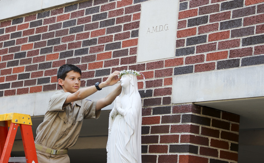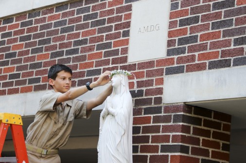 Pre-freshman Connor Campbell places a crown of flowers on the head of the statue of the Blessed Virgin Mary at assembly on Monday morning. “May Crowning” is a traditional Roman Catholic ritual that honors the Virgin Mary as “the Queen of May”. The Marian statue at Jesuit is located at the heart of Traditions Courtyard, where students meet for assembly every Monday and Friday.
