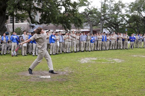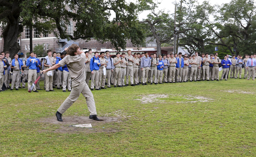 Everyone’s eyes went skyward as senior Grant Saunders hit his third home run hit in a row. The second day of Senior week was a day for eating jambalaya and hitting cabbage balls. The seniors ate jambalaya made by Mr. Bill Poynot and participated in a Cabbage Ball Home Run Derby. The rules were simple—hit as many home runs as you can before you get three strikes, then you were out! Although Saunders made a valiant effort, he was bested by classmate Dylan McKeough who hit four home runs in a row and was crowned the king of the derby.