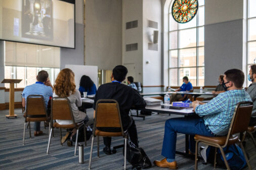 Assistant to the president for mission Jeremy Reuther ’01 and academic assistant principal Kathy Juhas lead the new teachers in an exercise about the life of St. Ignatius of Loyola. Jesuit is excited to welcome all the new members of the faculty as the start of school is right around the corner.