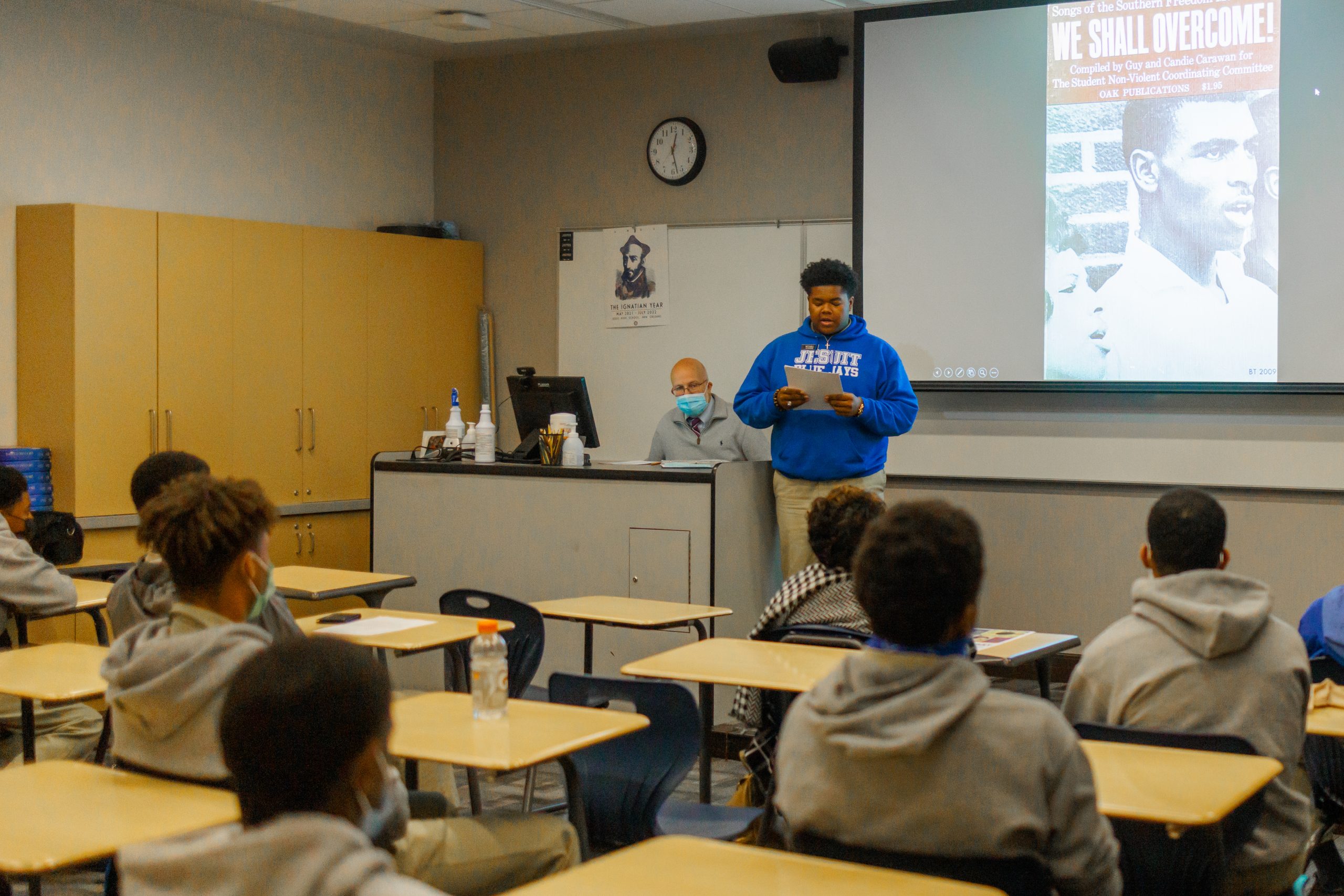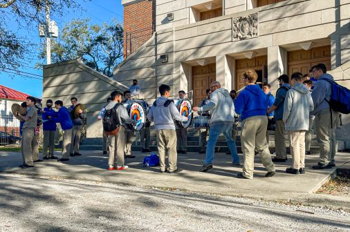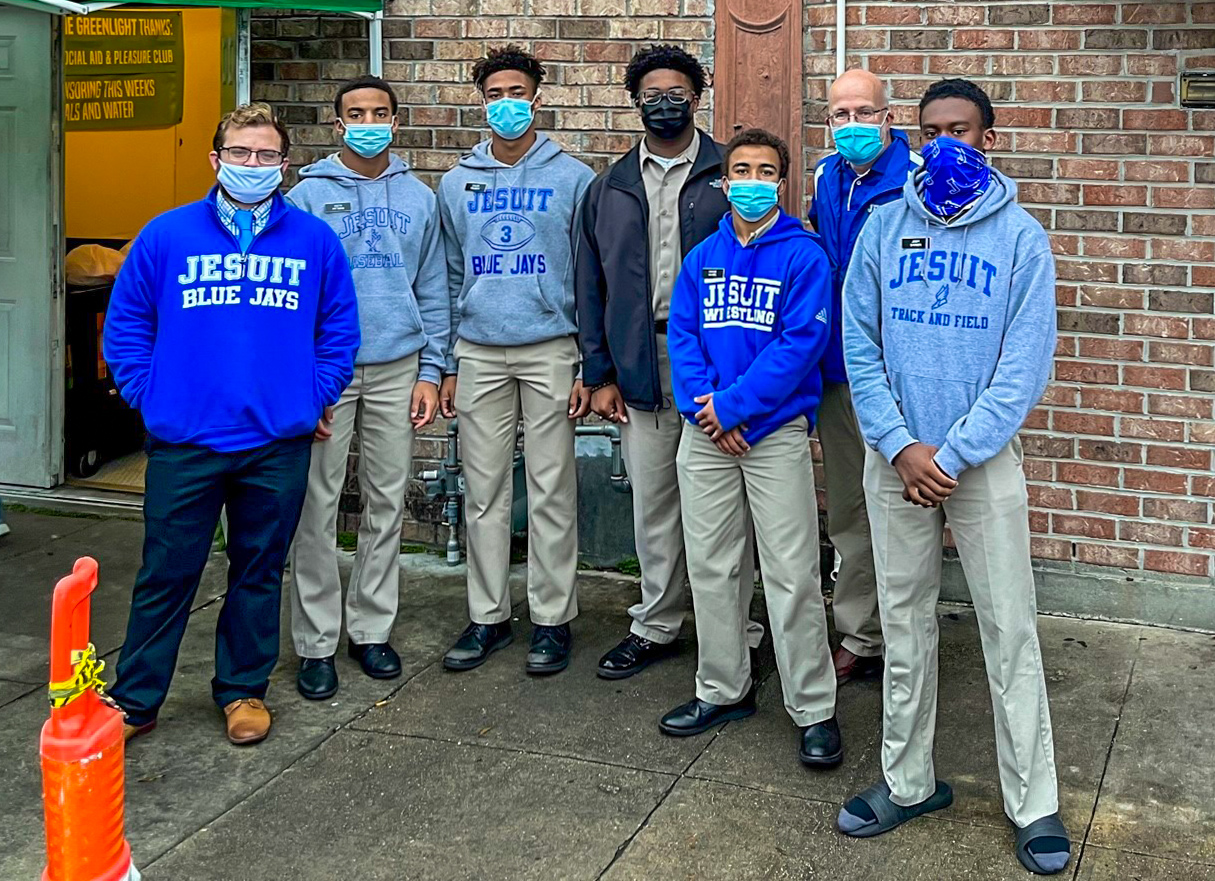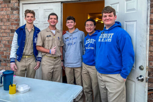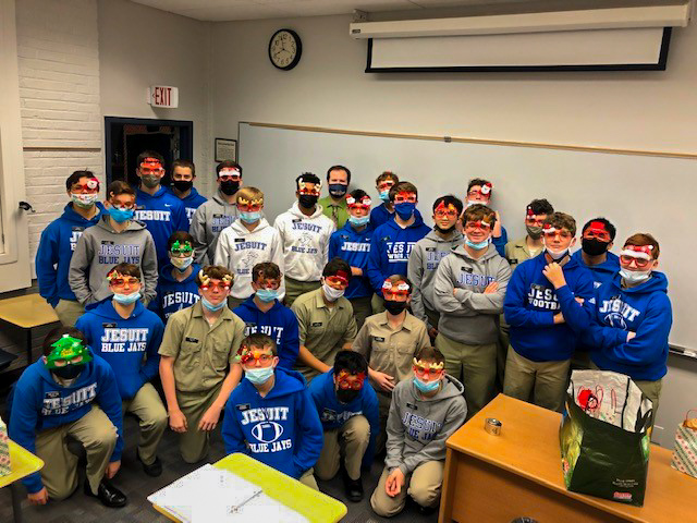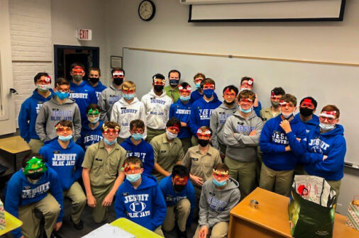 On Wednesday, Feb. 9, members of the Jesuit Men of Color and the Philelectic Society travelled to the Jefferson Performing Arts Center for a matinee performance of “FLY.” The play was about WWII African American fighter pilots known as The Tuskegee Airmen, and the production featured Jesuit alumnus and former Phil, L.G. Williams ’12, as the tap dancing griot. In his role, L.G. portrayed a character influenced by the West African traditional griot: a storyteller, poet, and musician who passes on oral history. L.G. is seen here with his former director, Mrs. Kate Arthurs-Goldberg, the Phils, and JMOC members who attended the show. JMOC Moderator Jay Combe ’83 was also in attendance, as was coach Rudy Horvath ’86 who served as the driver.