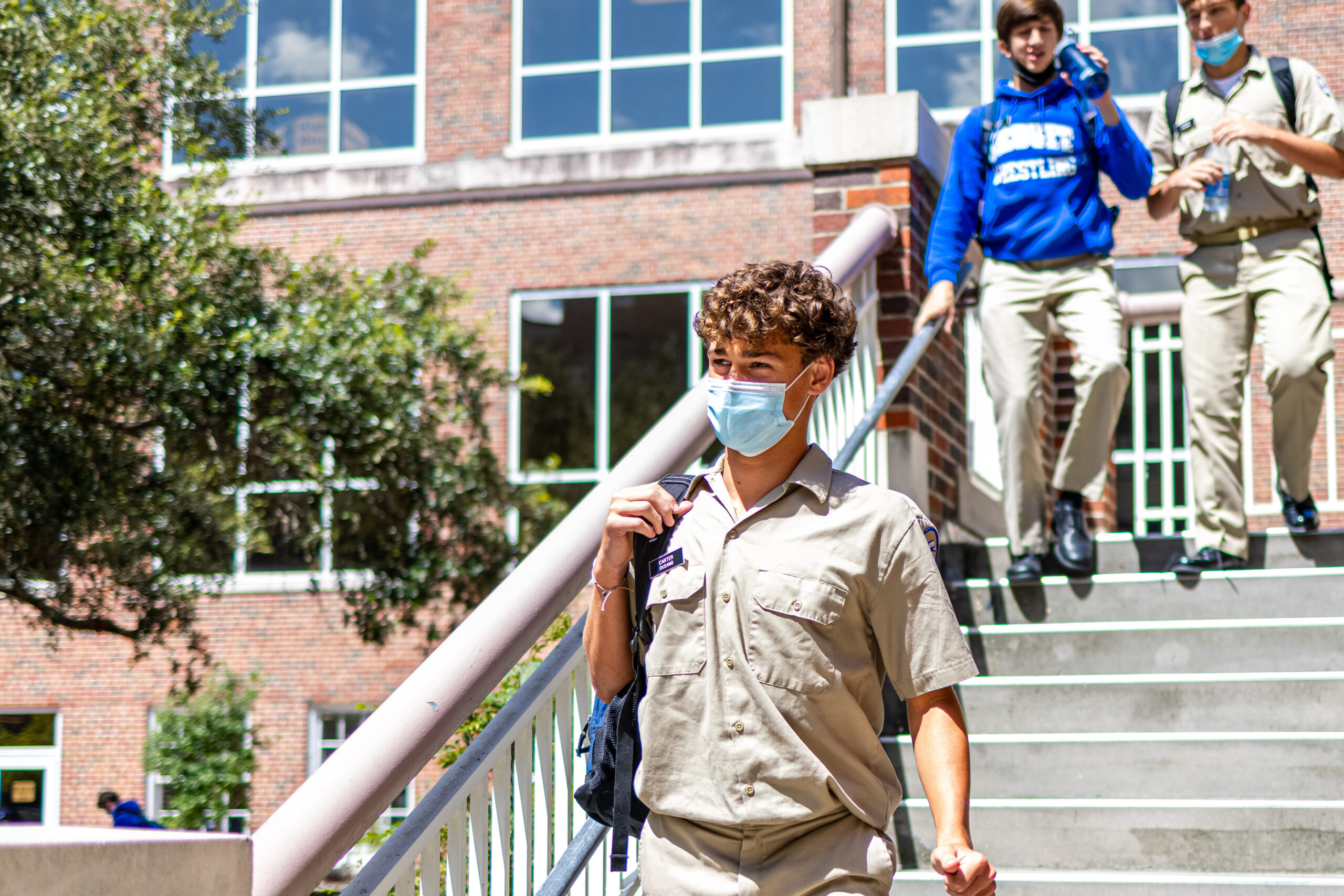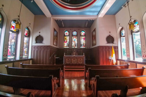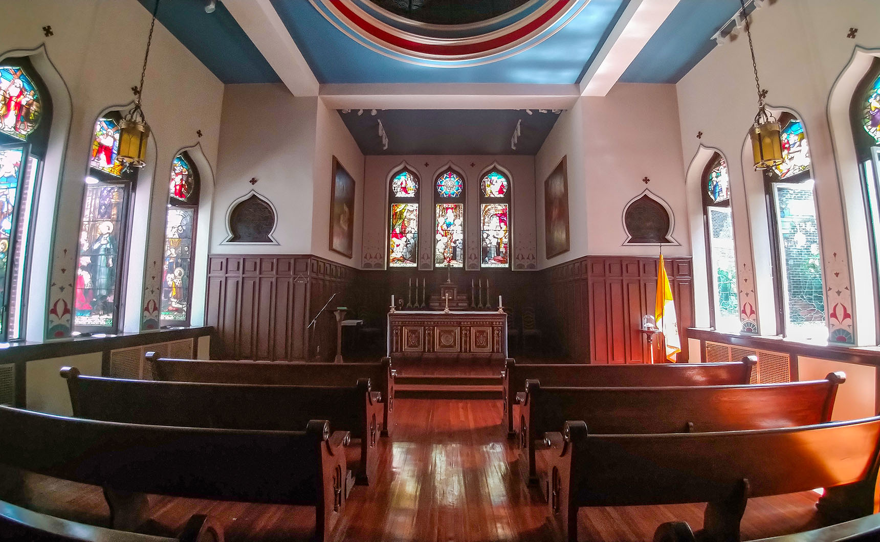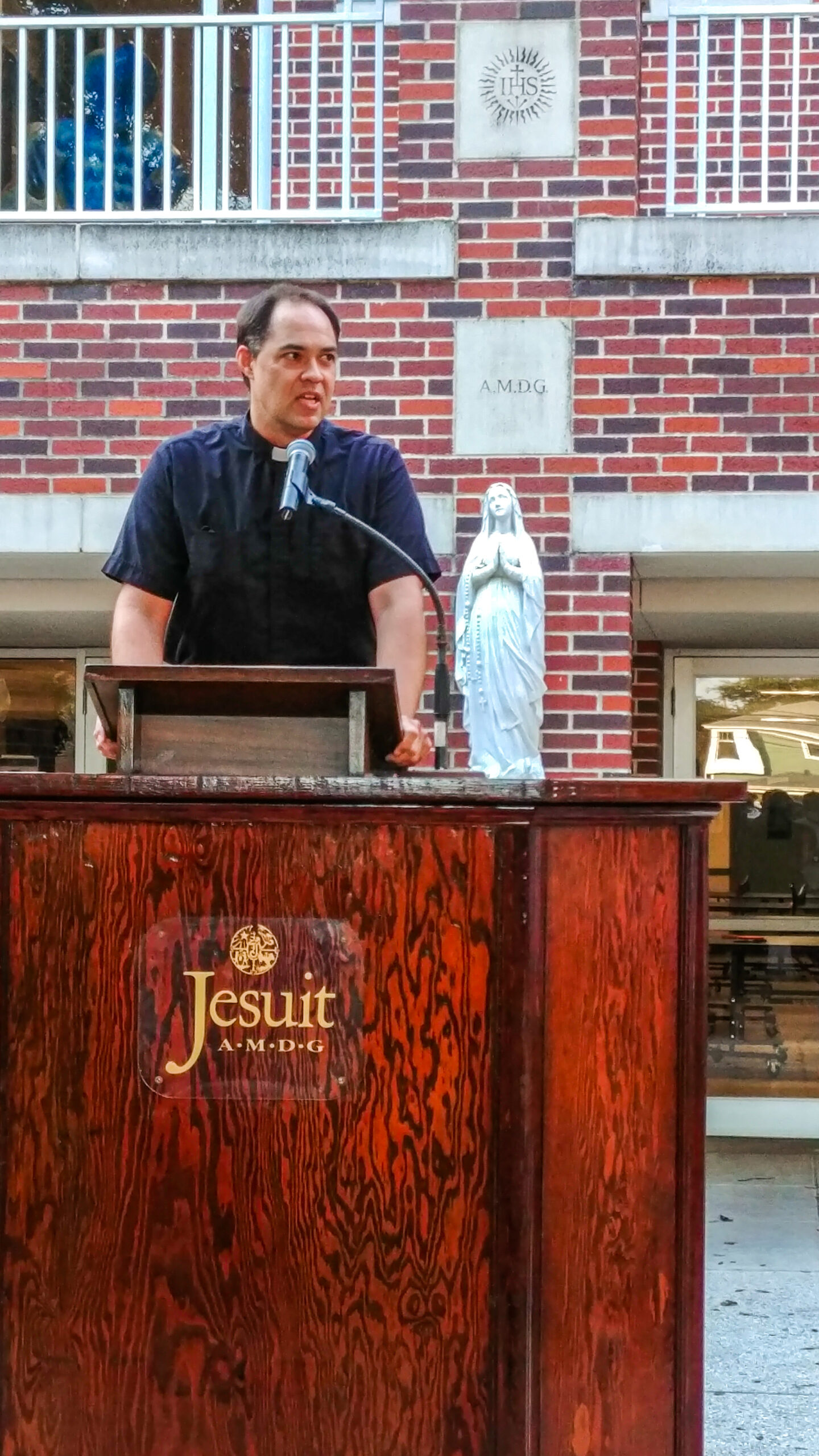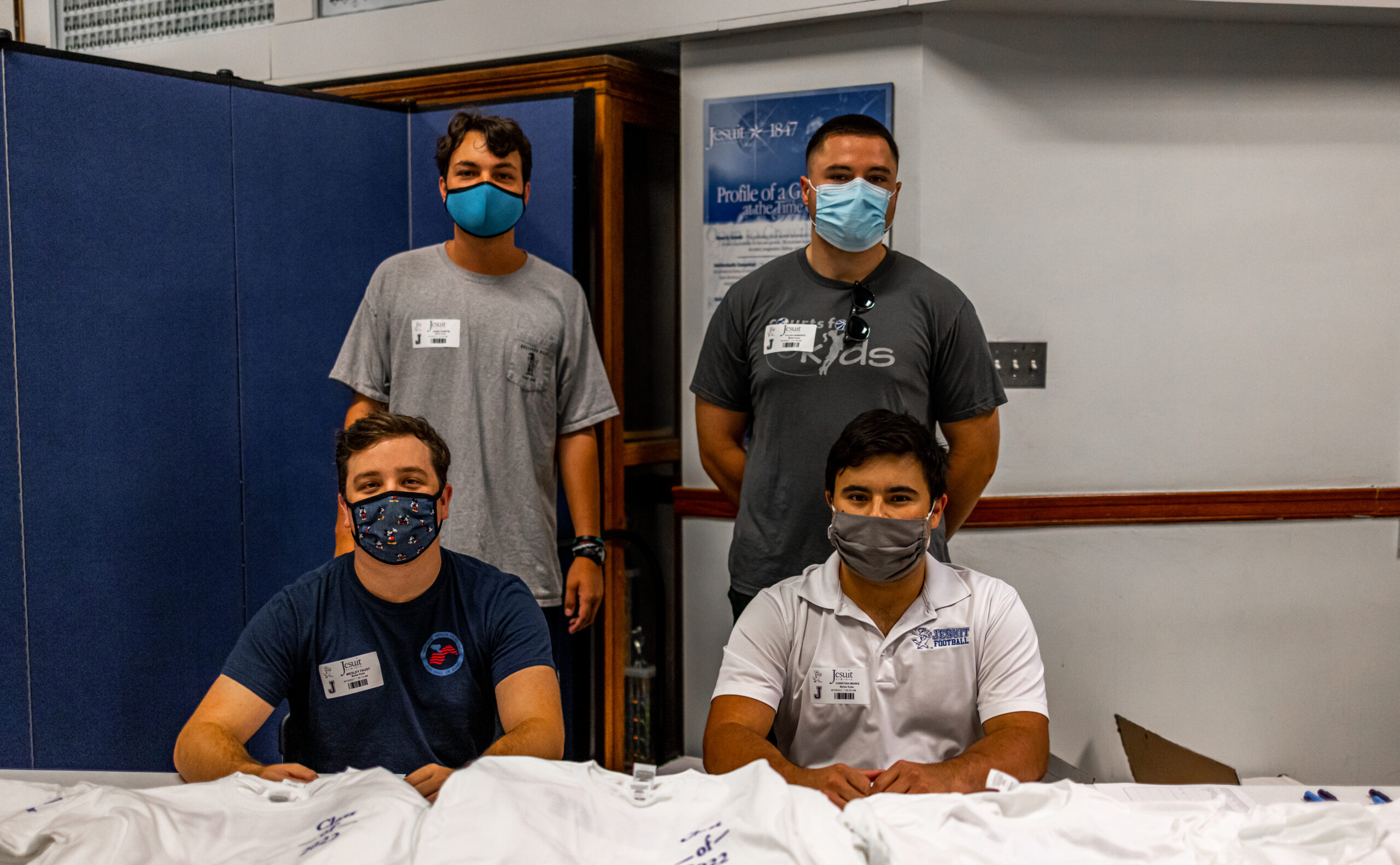 With no electricity or running water on campus, the Holy Name of Jesus Chapel—known by students and alumni as the “small chapel” on campus— continues to be used by the community of Jesuits on Carrollton & Banks. In this rare photo, the iconic stained glass windows are opened to allow airflow into the chapel. Click here to glimpse Fr. John Brown, S.J., conducting the Rite of Eucharistic Exposition and Benediction assisted by Jeff Miraflor, S.J., while Fr. Stephen Kramer, S.J., looks on in prayer.
