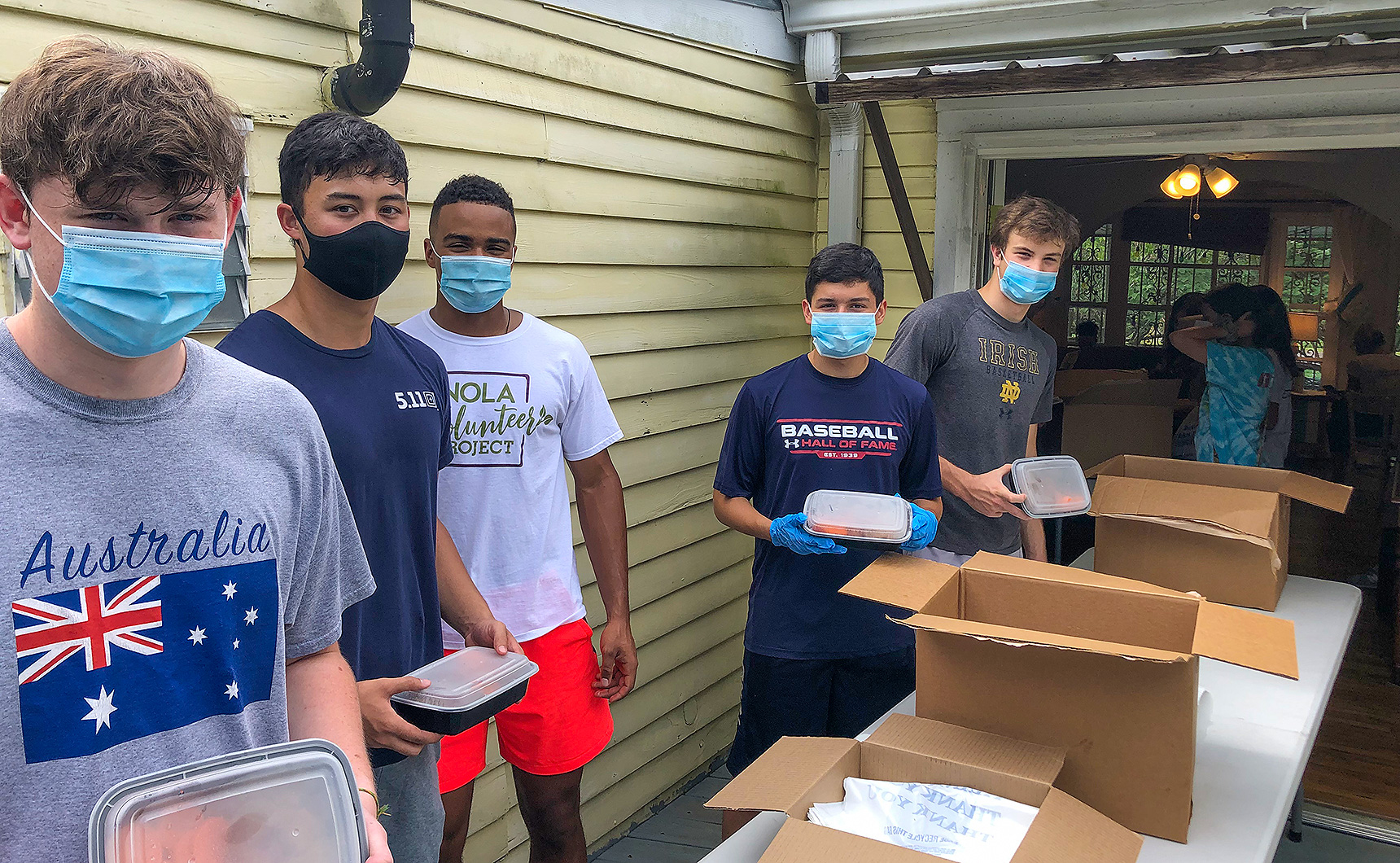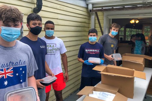 Although many of Jesuit’s service projects have been put on hold due to COVID-19, five rising seniors are still finding ways to serve those in need. Thomas Grady, Seb Upshaw, Will Hawkins, Joshua Guzman, and Chris Gillen have been working with the NOLA Tree Project, which has taken a break from beautifying New Orleans’ public spaces to focus on making sure that the elderly and disabled don’t go hungry during the Coronavirus crisis. These Blue Jays and other New Orleans high school students pack meals donated by Second Harvest Food Bank and deliver them to those who cannot leave their homes during the pandemic.