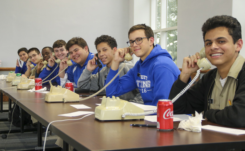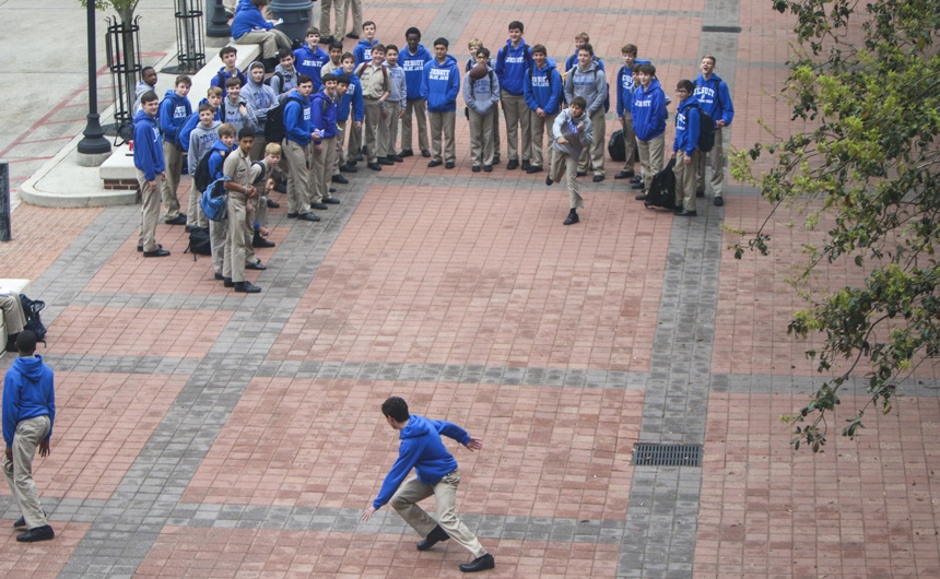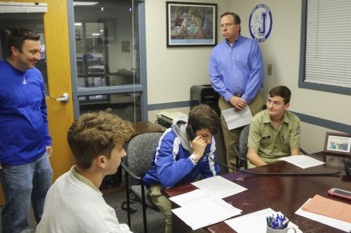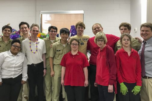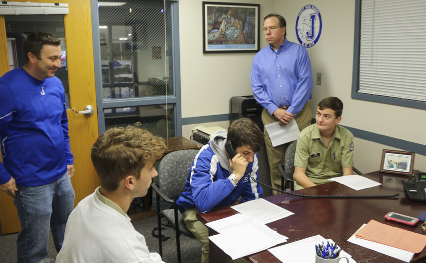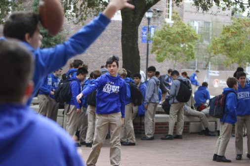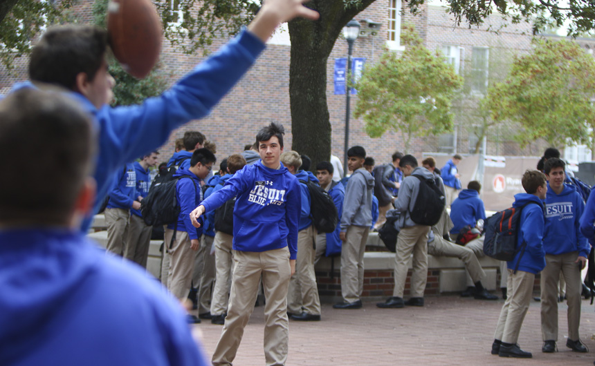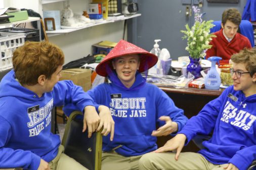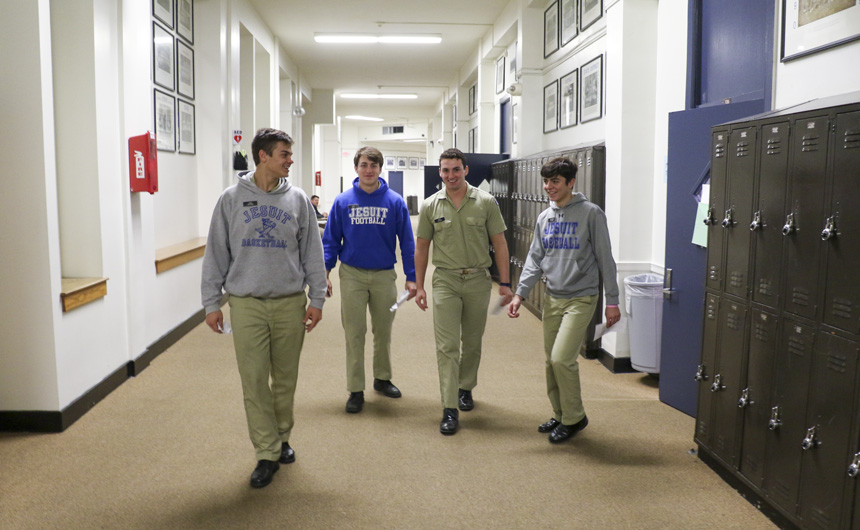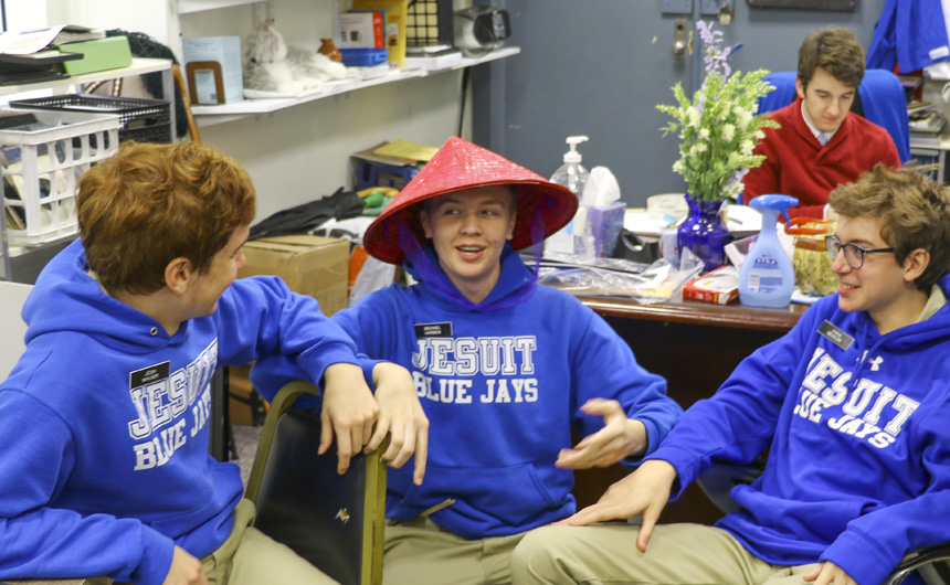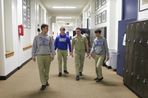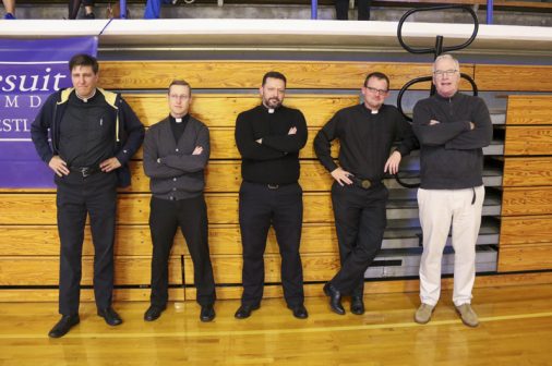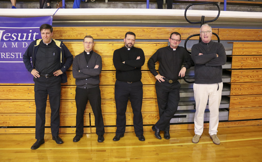 The Senior Night wrestling dual meet in Benson Arena saw high fives, five-second near falls, and five-point leads. It also saw five Jesuits take time out of their evening schedules to show support for the place they call home. (Pictured here, from left) Theology teacher Fr. David Paternostro, S.J., Fr. Stephen Kramer, S.J., interim president Fr. John Brown, S.J., school chaplain Fr. Kevin Dyer, S.J., and alumni chaplain Fr. Paul Shaughnessy, S.J. stand along the visitors bleachers between matches to enjoy a great view of the wrestling meet and the large crowd of Jesuit students, parents, and friends. Go, Jesuits’!