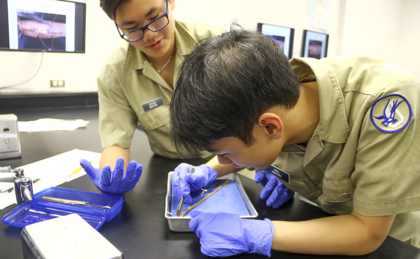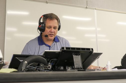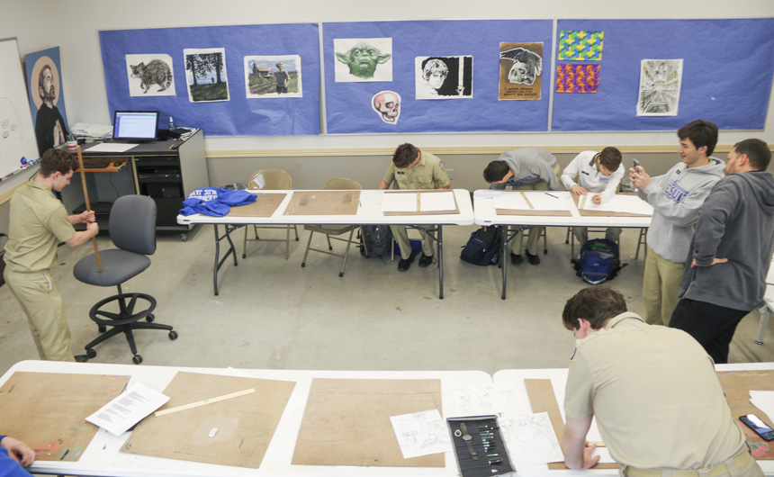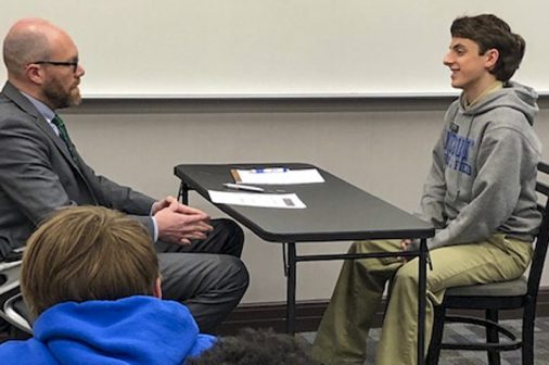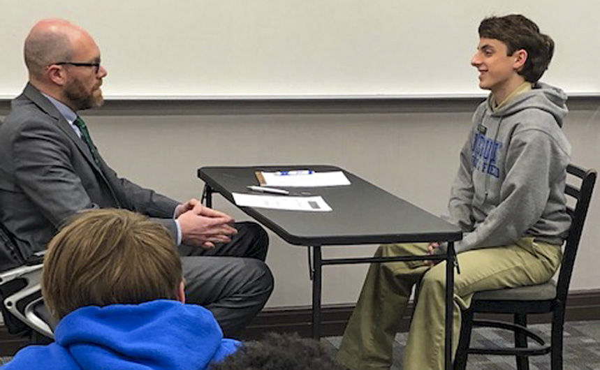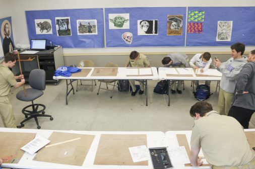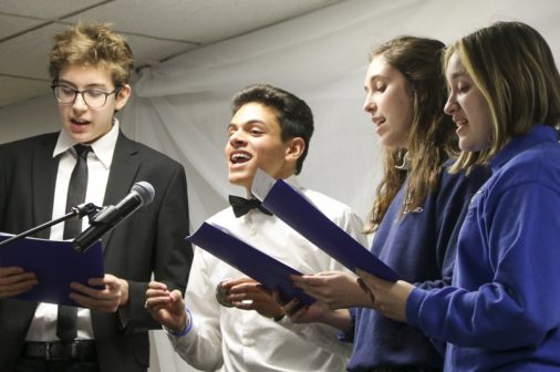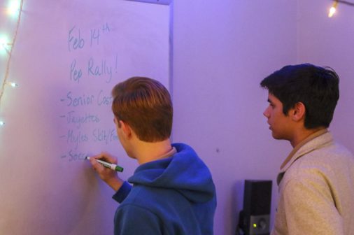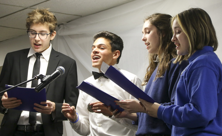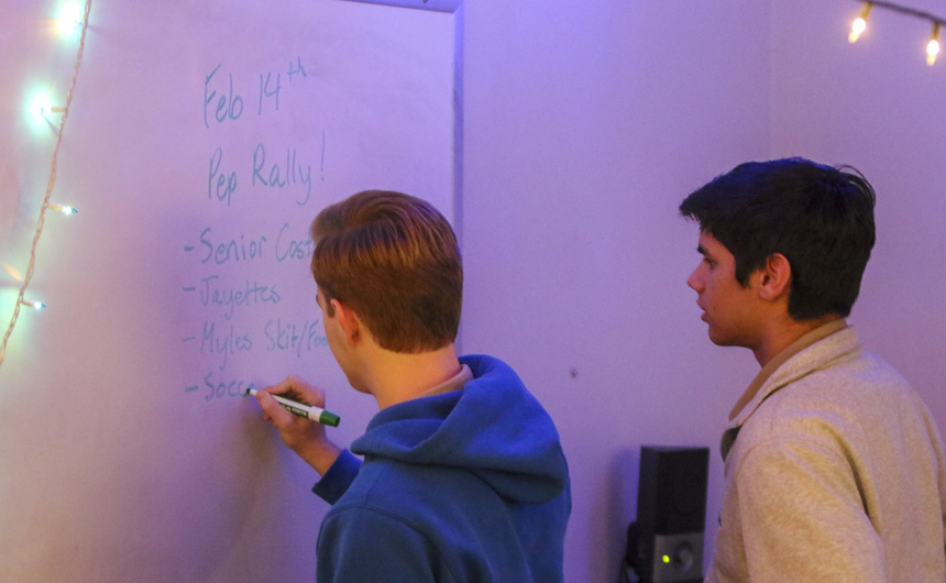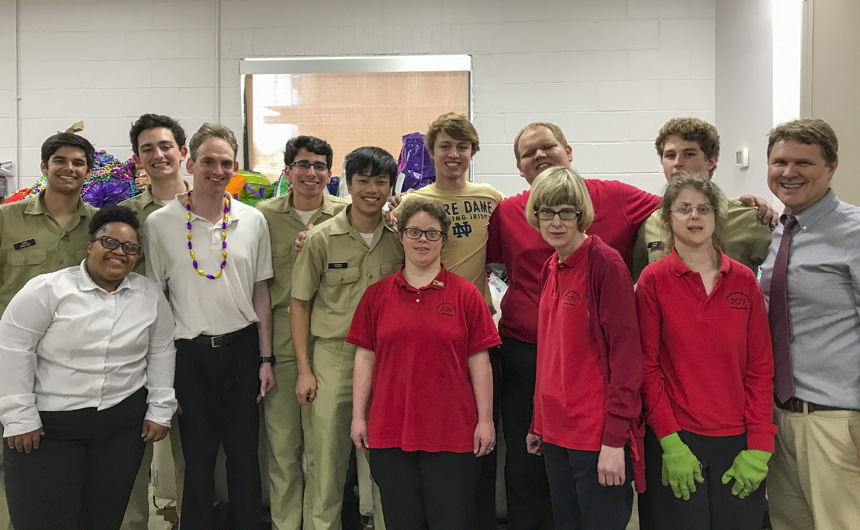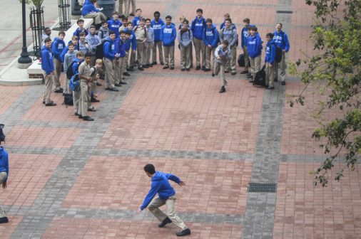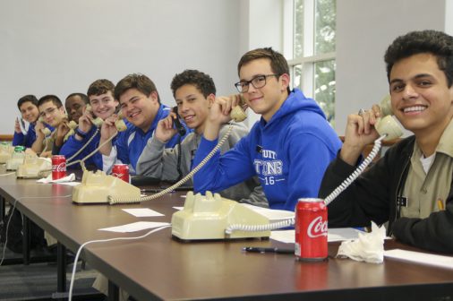 The Senior Night wrestling dual meet in Benson Arena saw high fives, five-second near falls, and five-point leads. It also saw five Jesuits take time out of their evening schedules to show support for the place they call home. (Pictured here, from left) Theology teacher Fr. David Paternostro, S.J., Fr. Stephen Kramer, S.J., interim president Fr. John Brown, S.J., school chaplain Fr. Kevin Dyer, S.J., and alumni chaplain Fr. Paul Shaughnessy, S.J. stand along the visitors bleachers between matches to enjoy a great view of the wrestling meet and the large crowd of Jesuit students, parents, and friends. Go, Jesuits’!