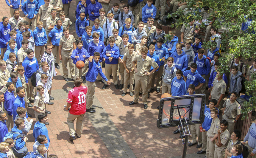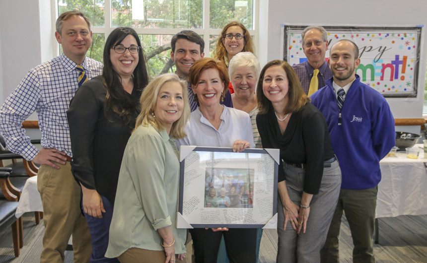 Ms. Mollie Roberts, pictured here with the guidance department at her retirement party, has competently and lovingly served Jesuit for 14 years as a member of the Guidance Department. She has served in several capacities – department head, overseer of the Peer Support Program, the Advanced Placement Program, College Night, and the Rising Junior Interview Program. While she has served mainly as a grade level counselor, she has also served as a College Placement Counselor. Ms. Roberts has been a member of the school’s Administrative Team, Academic Council, and Ignatian Identity Team and has directed the District Rally Program. A woman of prayer and deep faith, Ms. Roberts completed the Spiritual Exercises of St. Ignatius, has attended many Kairos retreats, and regularly participates in Friday adoration. In 2013, Jesuit presented her with its Profile of a Jesuit Teacher Award. Thank you, Ms. Roberts, for serving the students of Jesuit High School so lovingly for the past 14 years. All the best in your retirement.