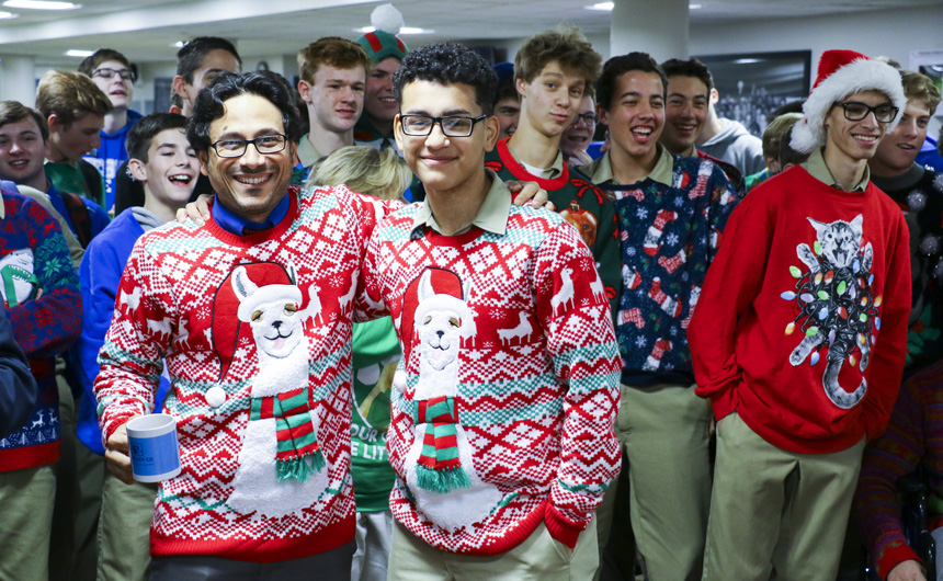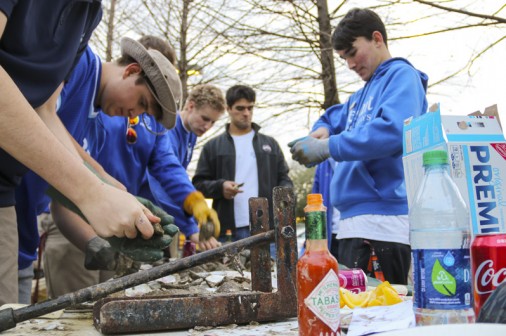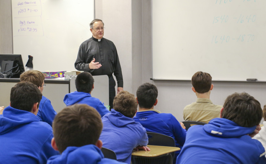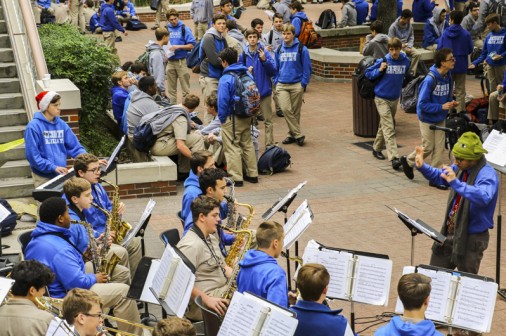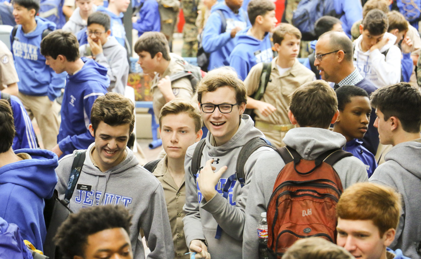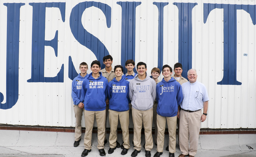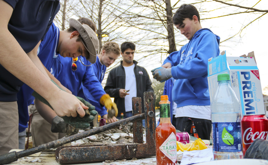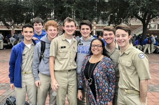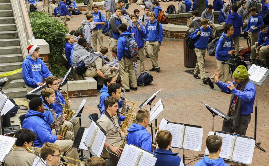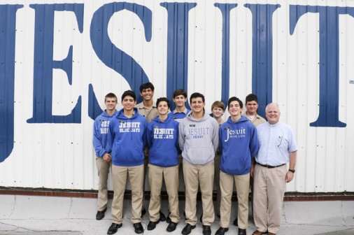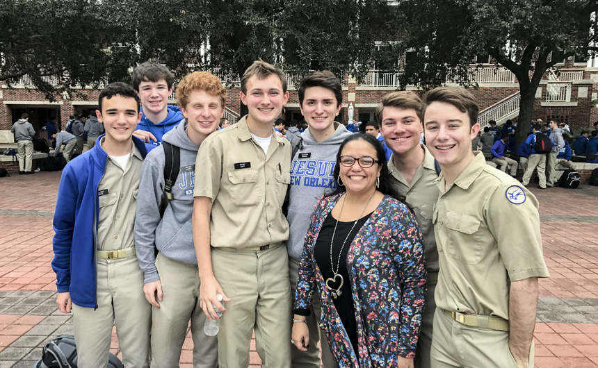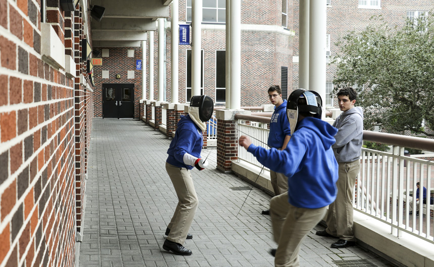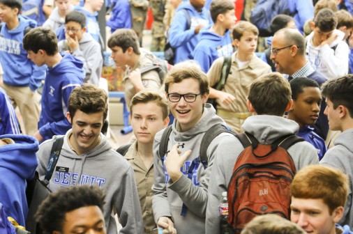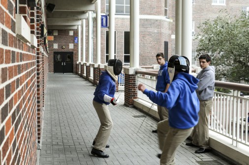 Starting tonight, the senior-directed One Act Play and Improv Comedy Festival celebrates its 10th year with nine plays directed by 11 seniors. More than 50 cast and crew members, along with the J-Troupe Improv comedy team, are donating their time and talent to support Second Harvest Food Bank. The festival features the world premieres of two new plays written by Phils. Senior Thomas Sagona’s “The Shattered Looking Glass” and senior Will Hite’s “Before the Third” will each be performed three times this weekend. Pictured here, pre-freshman Matthew Busenlener, Sydney Worthy (senior, Ursuline), Jennifer Hawkins (senior, Haynes Academy), Emily Bennett (senior, Cabrini), and senior Andrew Busenlener act out a scene from “A Murdered Mystery.”
