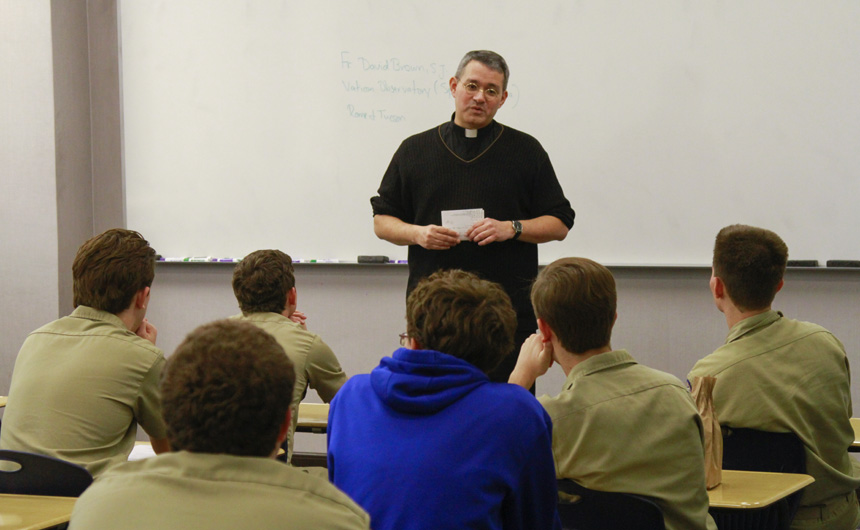 After a long holiday break, Jesuit’s Sodality kicked off the third quarter with a talk by Fr. David Brown, S.J., on his experience of faith and science. Fr. Brown, who formerly taught at Jesuit as a scholastic, is now a priest at the Vatican Observatory and returns to Rome tomorrow. Sharing stories from his journey to faith, to the priesthood, to the Society of Jesus, and eventually to the Vatican observatory, Fr. Brown remarked, “Most people think that science points in the direction of doubt, but I have found in my years of studying physics that the more I learn about the universe through science, the more I come to wonder at the creator of the universe, whose wisdom and power are responsible for all the beauty we see around us.”