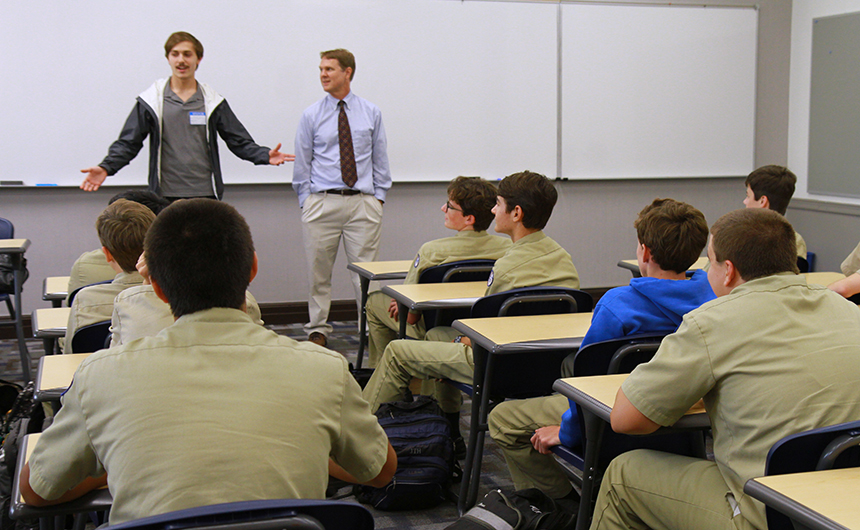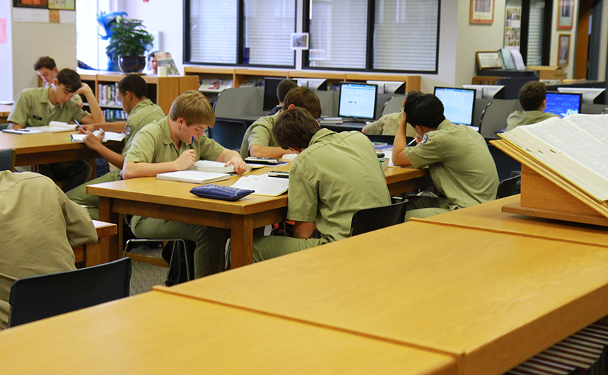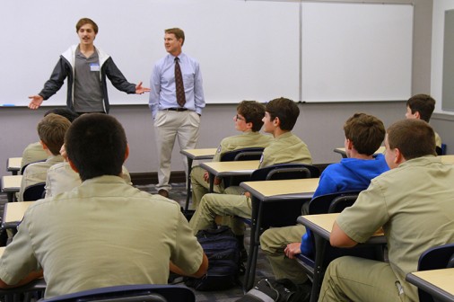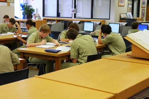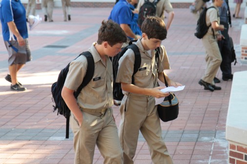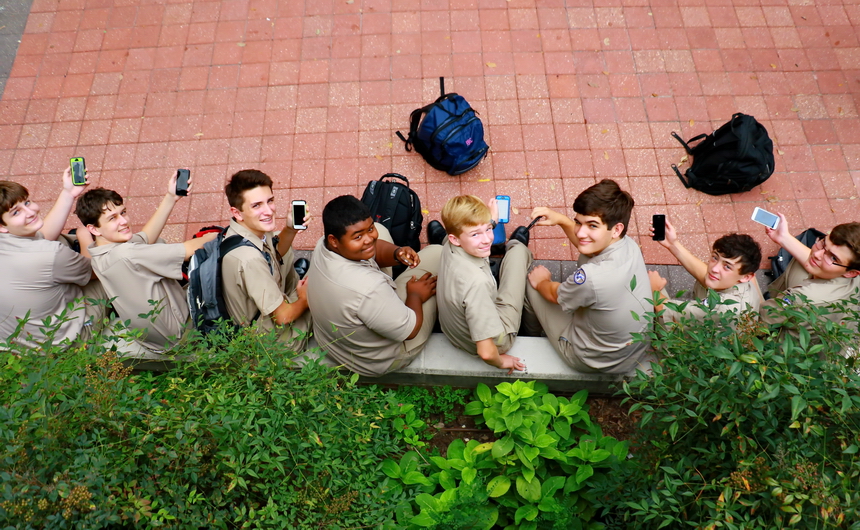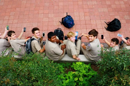 During school time, students must have their cell phones turned off and out of sight. Woe to the Blue Jay whose cell phone goes off during class. But moments after the dismissal bell rings, cell phones become ubiquitous around Jesuit. They magically appear everywhere. These eight sophomores, seated in the Traditions Courtyard while patiently waiting to be picked up Friday afternoon, were thoroughly engrossed with their various cellular devices. All eight Blue Jays said they were using their cell phones to text friends and family. From left are Stephen Ecuyer, Jackson Butterbaugh, Clayton Merwin, Brian Taylor, Malcolm Sundell, Robert Christmann, Albert Bienvenu, and Eddie Redmann.