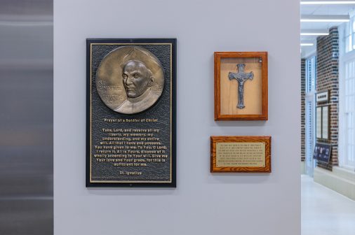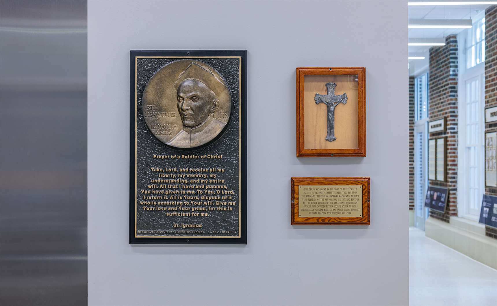 On the first floor of the Madonna Della Strada Building, a special display contains a cross found inside the tomb of Jesuit’s founder, Fr. Jean Baptiste Maisounabe, S.J. He was buried alongside Fr. Joseph Soller, S.J., a preacher and pastoral minister, and Fr. George Blackney, S.J., a teacher and renowned preacher.