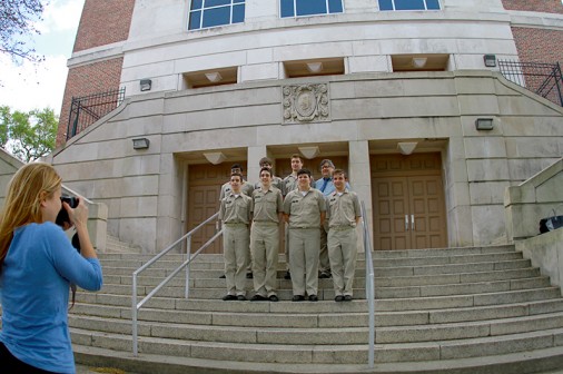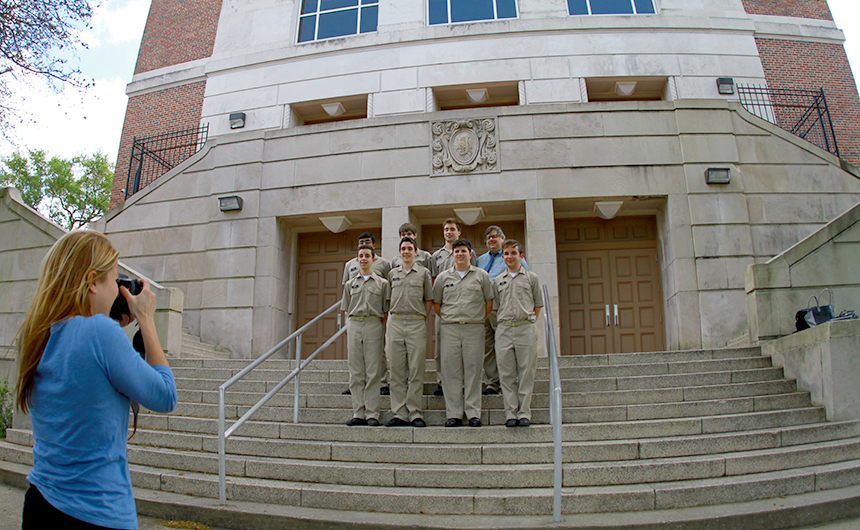 The Blue Jay yearbook moderator Ms. Jennifer Buuck (far left) takes a photo of The Blue Jay newspaper staff for inclusion in the 2014-2015 annual. Ms. Buuck, along with members of the yearbook staff, are in the process of compiling photos of the nearly 100 athletic teams and co-curriculars chronicled each year in the publication.
