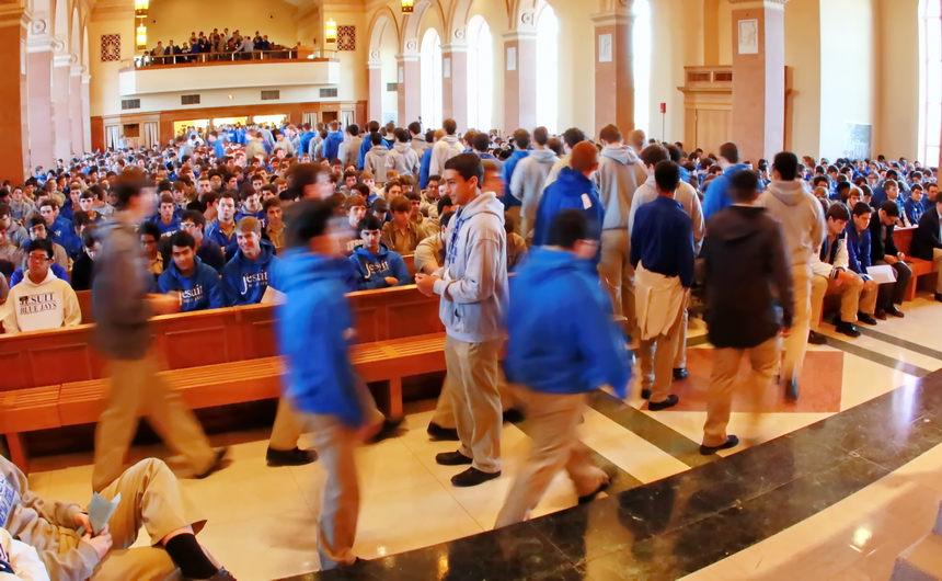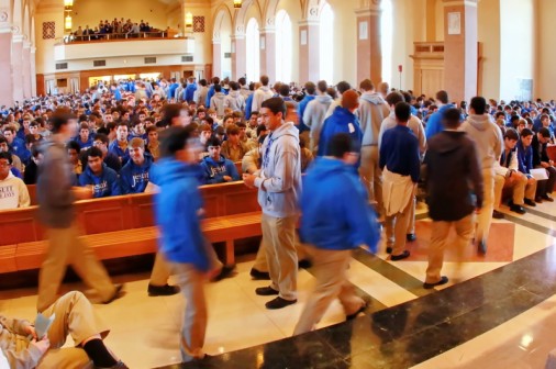 Senior Cole Retif (standing center in gray pullover) serves as an usher to direct Blue Jays to their pews at January’s monthly Mass, celebrated Wednesday for the entire student body in the Chapel of the North American Martyrs. The principal celebrant was Jesuit president Fr. Anthony McGinn, S.J. ’66, who in his homily, spoke of the challenge we face in listening to God’s word and being open to God’s will in our lives: “We ask God for the grace, strength, and insight in our daily lives to see where He is leading us, the power He has given us, the power to heal. We all have power to heal, not physically, but we all have power to heal relationships… God gives us the strength to battle the forces of evil, the forces of evil that want to convince us that we are in charge; that ours is the kingdom, the power, and the glory; that force of evil that wants us to have our way always. The power of God, the power of the Spirit working in us enables us to respond as Jesus did… We ask God for grace and strength to make the right decisions in life.”