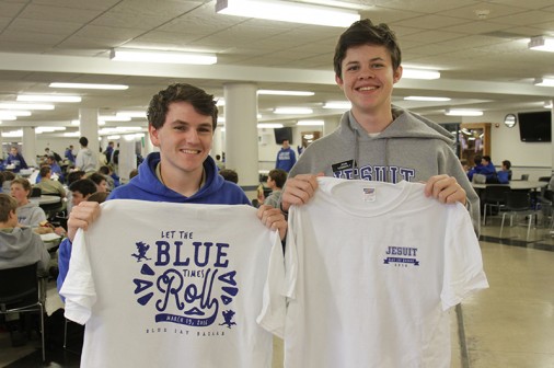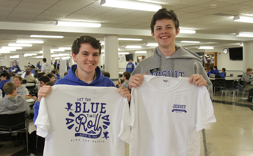Seniors Myles Kuss (left) and John Kemmerly display the 2016 Blue Jay Bazaar t-shirt. The shirt features a vintage-style design with the theme “Let the Blue Times Roll” on the back and the Jesuit logo on the front. Bazaar t-shirts will be sold tomorrow in the Student Commons for $10 each. T-shirt sales will resume after exams and at the Bazaar in the t-shirt booth. The Blue Jay Bazaar is Saturday, March 19.