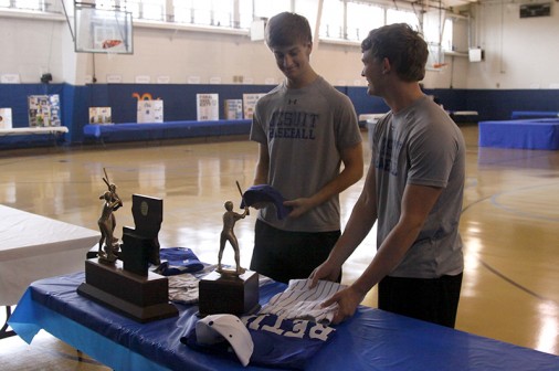 Senior Christian Latino (left) and junior Trent Forshag put the finishing touches on the Baseball team’s table on the third floor of the Roussel Building in preparation for tonight’s Open House. Prospective students and their families will be led across campus by student tour guides. The final stop on the tour is the Roussel Building, where prospective students can browse tables for some 60 co-curricular organizations, including Baseball. Latino and Forshag will be two of hundreds of current Blue Jays, faculty, staff, and alumni welcoming 4th-8th graders and their families at Open House.