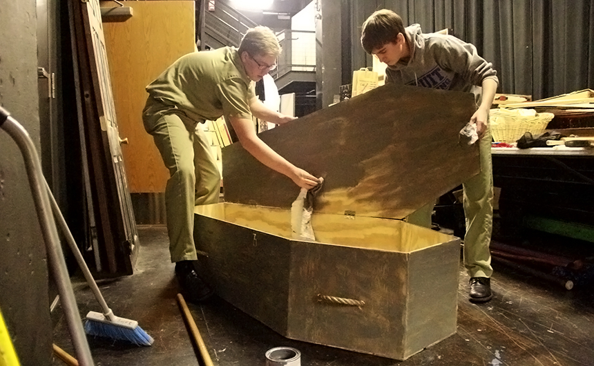 Sophomores Matthew O’Neill (left) and Blake Brown stain a coffin as part of last minute preparations for the Philelectic Society’s One Act Play and Improv Festival. The casket is a prop in Huck Finn, a show directed by Mr. D.J. Galiano ’07 and featuring a full cast of the newest Phils. The festival begins Thursday night and runs through Saturday, Jan. 24, with performances each night at 7:30 p.m. and a 2 p.m. matinee on Saturday. The festival also features shows directed by Philelectic Society seniors Kyla Zimmerman (Ursuline Academy), Ashley Busenlener (Benjamin Franklin High School), Alex Daigle (Jesuit), and Connor Hill (Jesuit) and performances by the J-Troupe. Admission is $5 per person or five canned goods per person. All proceeds will be donated to the Second Harvest Food Bank of Greater New Orleans. For more information, click here.