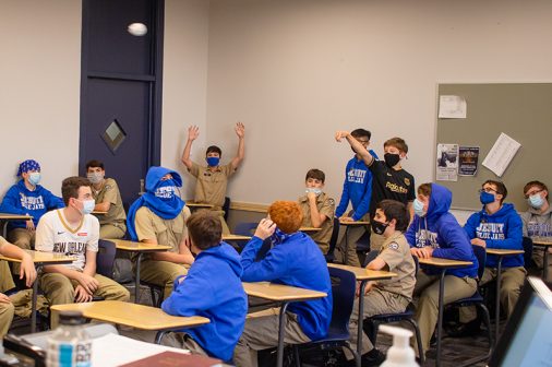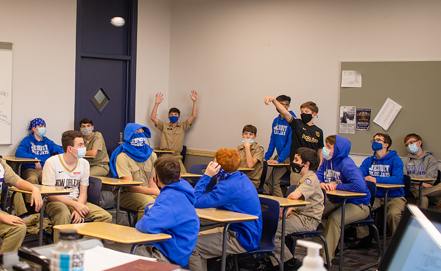 Daniel Augustin’s 5th and 6th period theology classes got to play a few rounds of “trash-ketball” last Friday, March 5, to prepare for their up coming exams. Donning their favorite sports jerseys students split into two teams and were quizzed with review questions. If they answered correctly they then were able shoot from different spots in the classroom to earn points for their team.