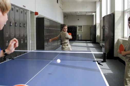 Pre-freshman Hunter Hoffmann shoots a topspin forehand across to classmate Skyler Pitisci during tryouts for the Table Tennis Team. Tryouts are held Wednesday and Thursday of this week after school. The team is one of the many co-curricular organizations seeking new members at the beginning of the school year.
