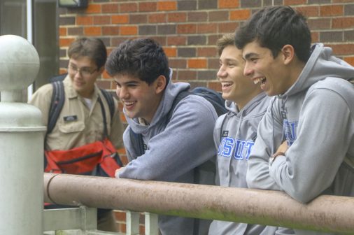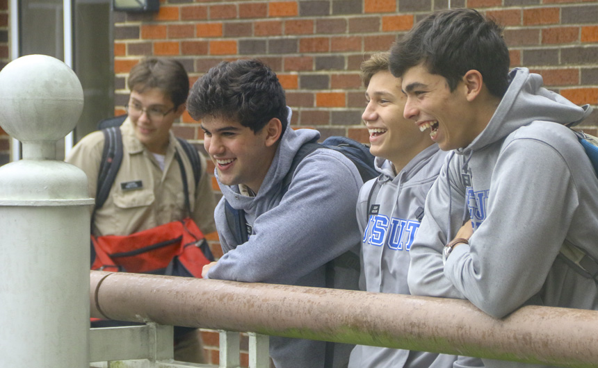 Juniors Gage Hebert, Colby Kosloski, and Parker Serio share a laugh over the winter weather and the lunchtime courtyard scene from the 3rd-floor balcony. After a day that, at one point, felt like 33° and had a windchill of 35°, the trio of Blue Jays and many others may be checking the Weather (jesuitnola.org/weather) before leaving for school each morning.